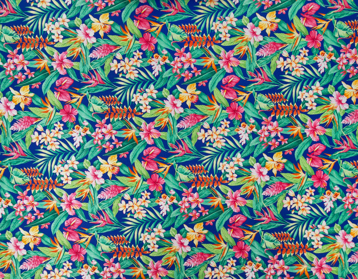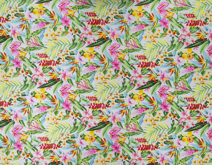 100% Cotton Poplin, 44/45"Wide, One-Way. All Over Watercolor Style Tropical Flowers, including Hibiscus, Plumeria, Heliconia, Orchids, Torch Ginger, and Bird...