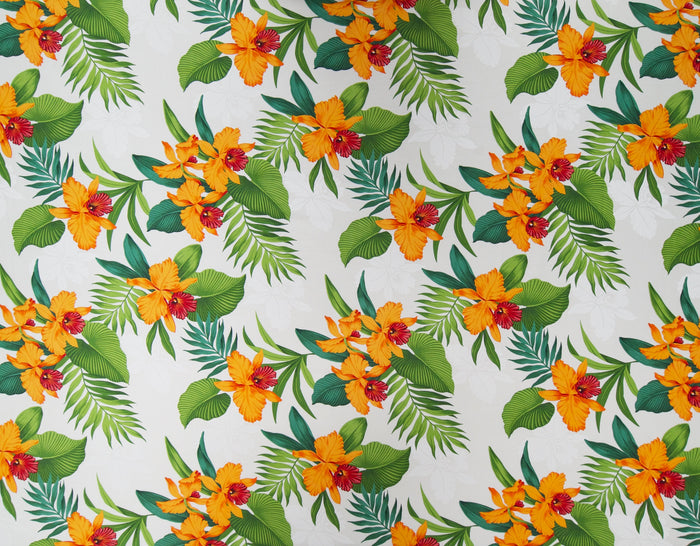 100% Cotton Poplin, 44/45"Wide, One-Way. Clusters of Realistic Orchids and Tropical Leaves on a Background of Tonal Orchids.