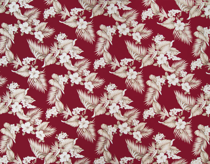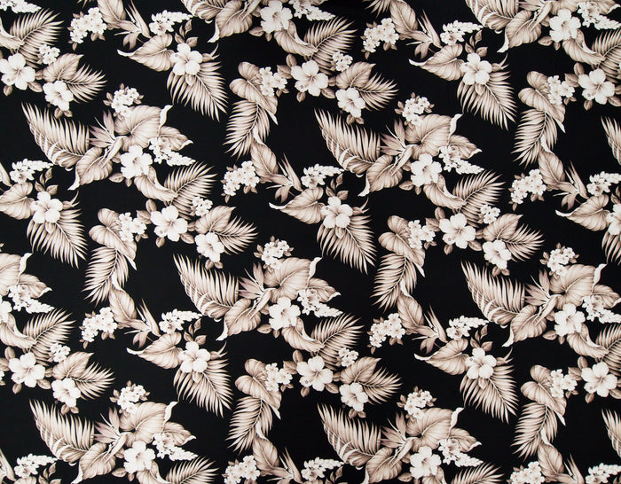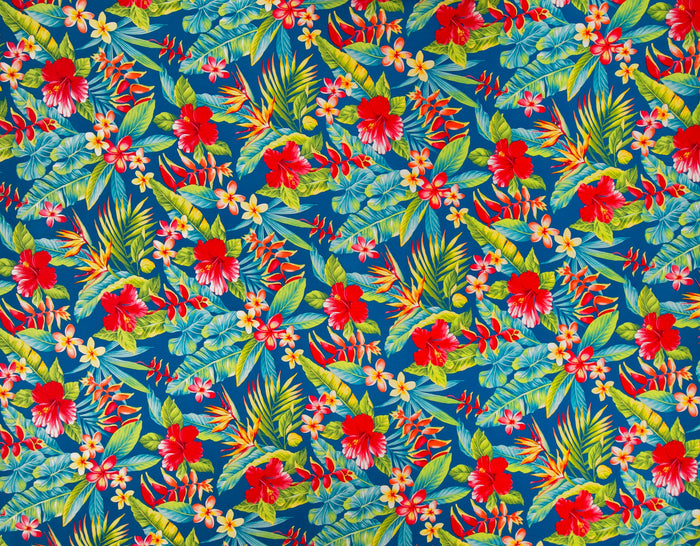 100% Rayon Poplin, 57" Wide, All-Over.  Realistic Hibiscus and Bird of Paradise Flowers and a Variety of Tropical Leaves.