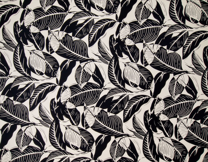 100% Rayon Poplin, 57" Wide, All-Over.  Abstract Tropical Leaves.