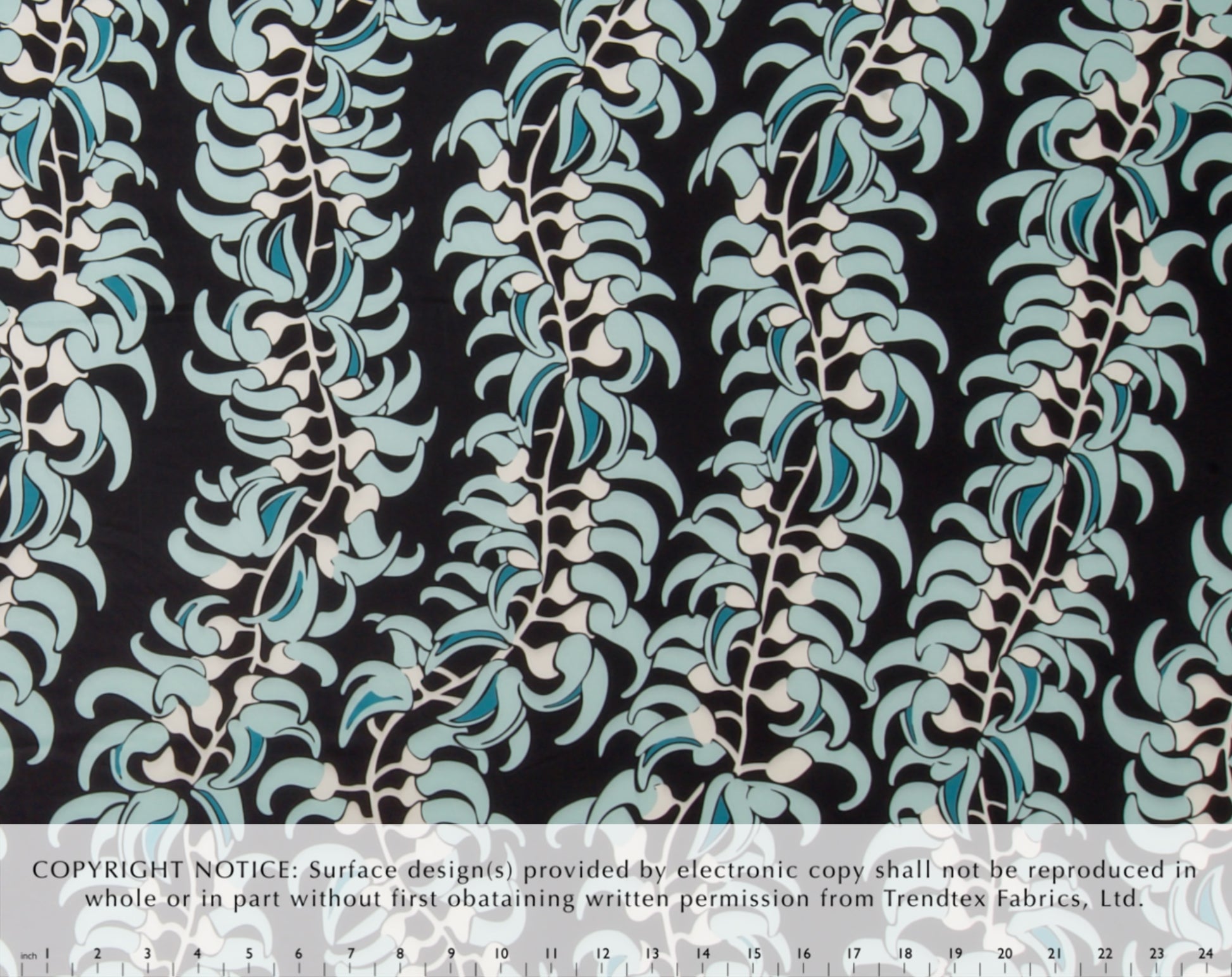 95% Polyester/5% Spandex Knit, 58” Wide, All-Over. Tropical Stylized Jade Vine Flowers.
