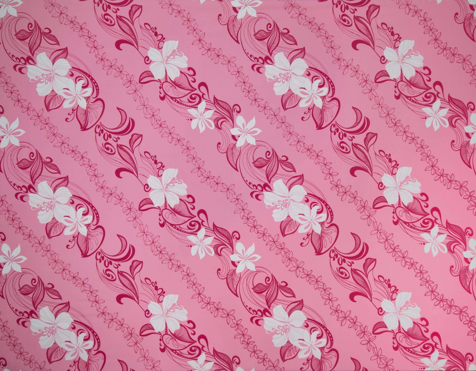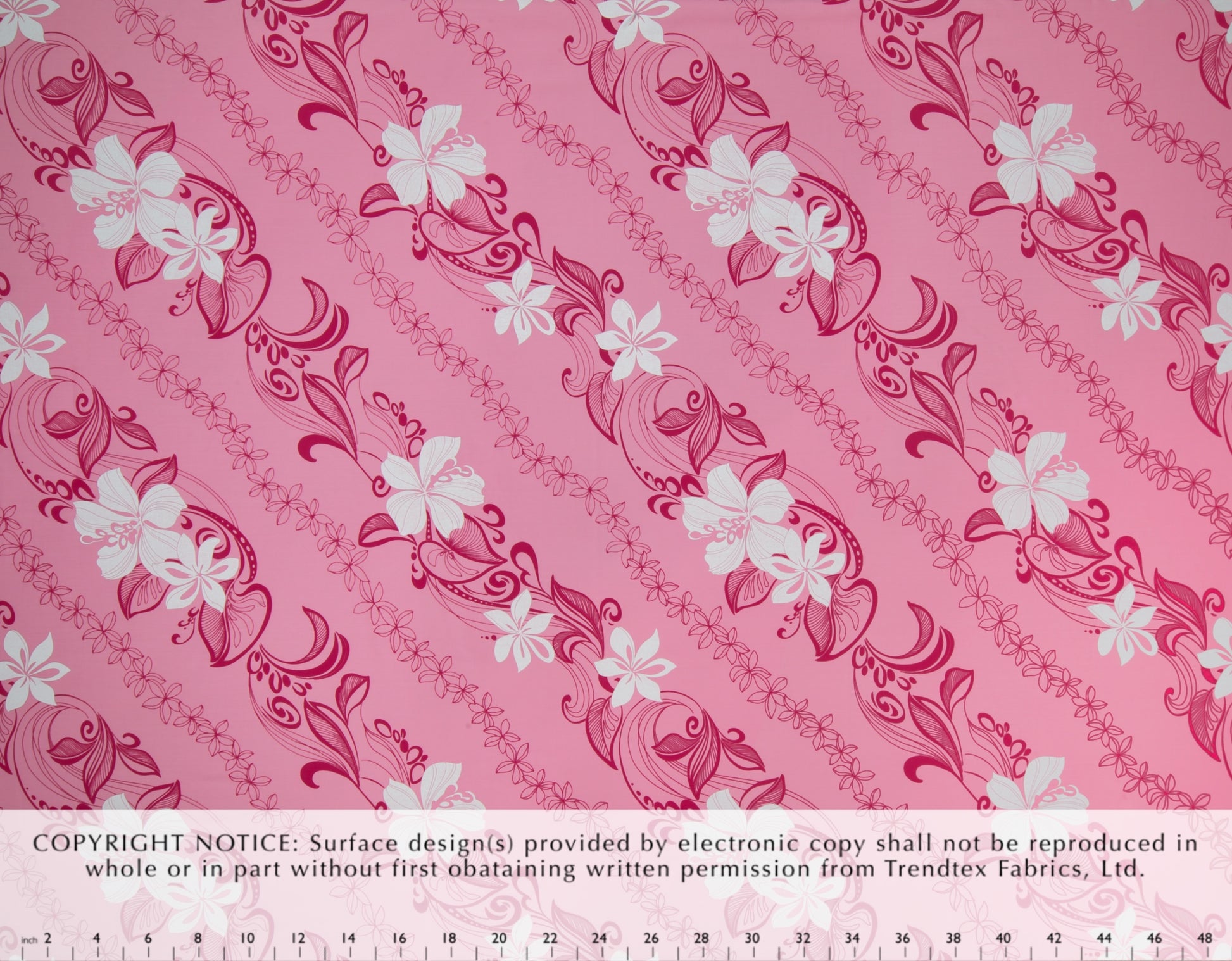 65% Polyester/35% Cotton Poplin, 44/45" Wide, All-Over. Diagonal Lines of Stylized Tropical Hibiscus and Tiare Flowers with Plumeria Flower Lei.