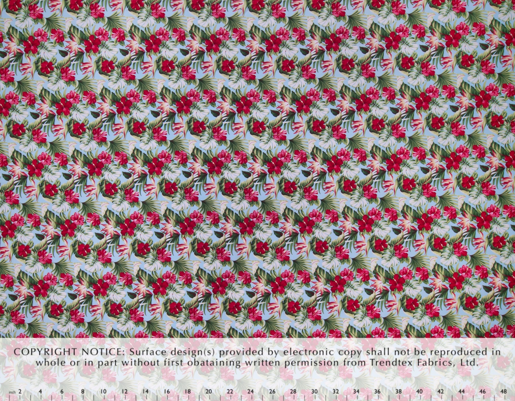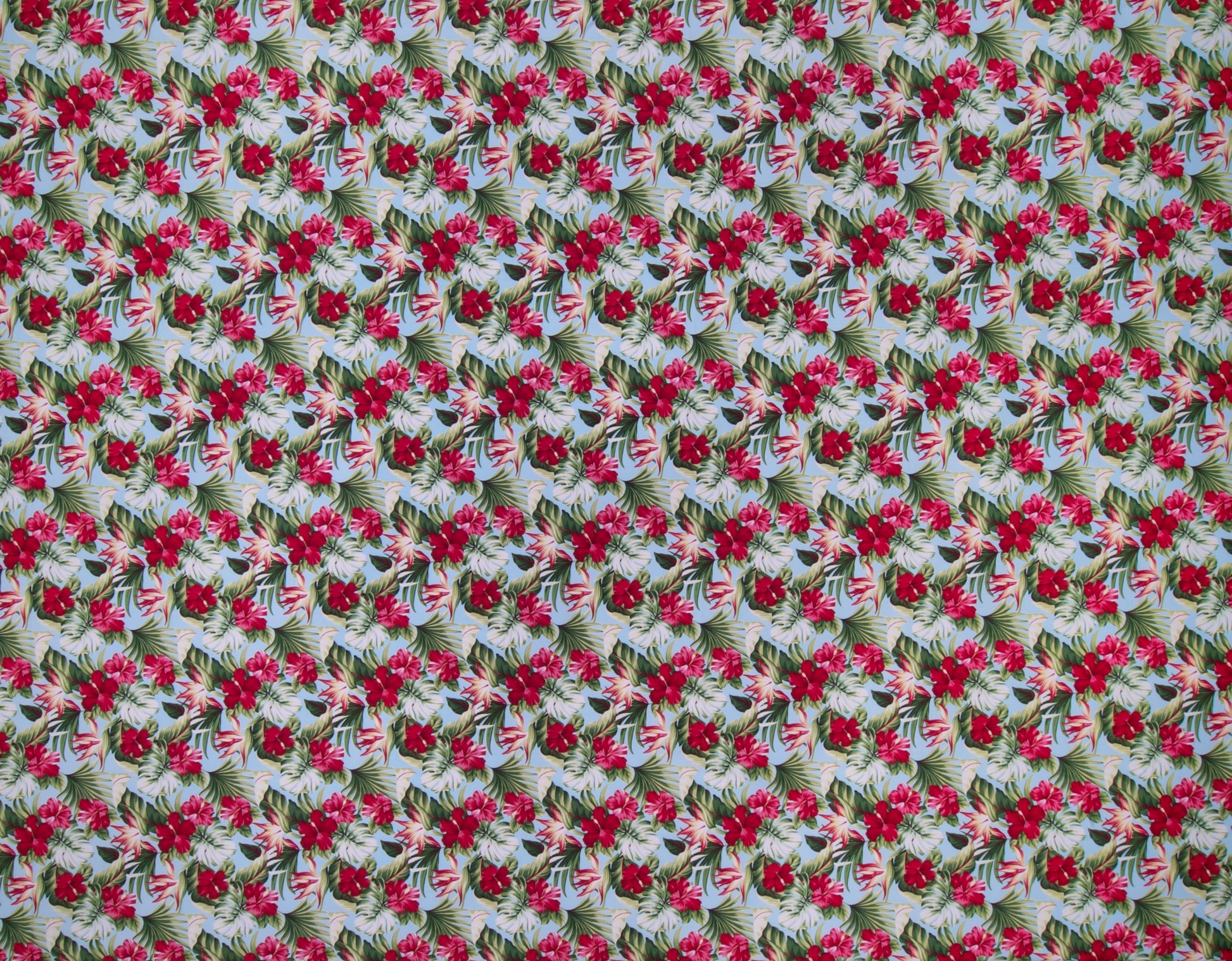 100% Cotton Poplin, 44/45"Wide, One-Way. Realistic Small Scale Hibiscus and Bird of Paradise Flowers with Tropical Leaves.