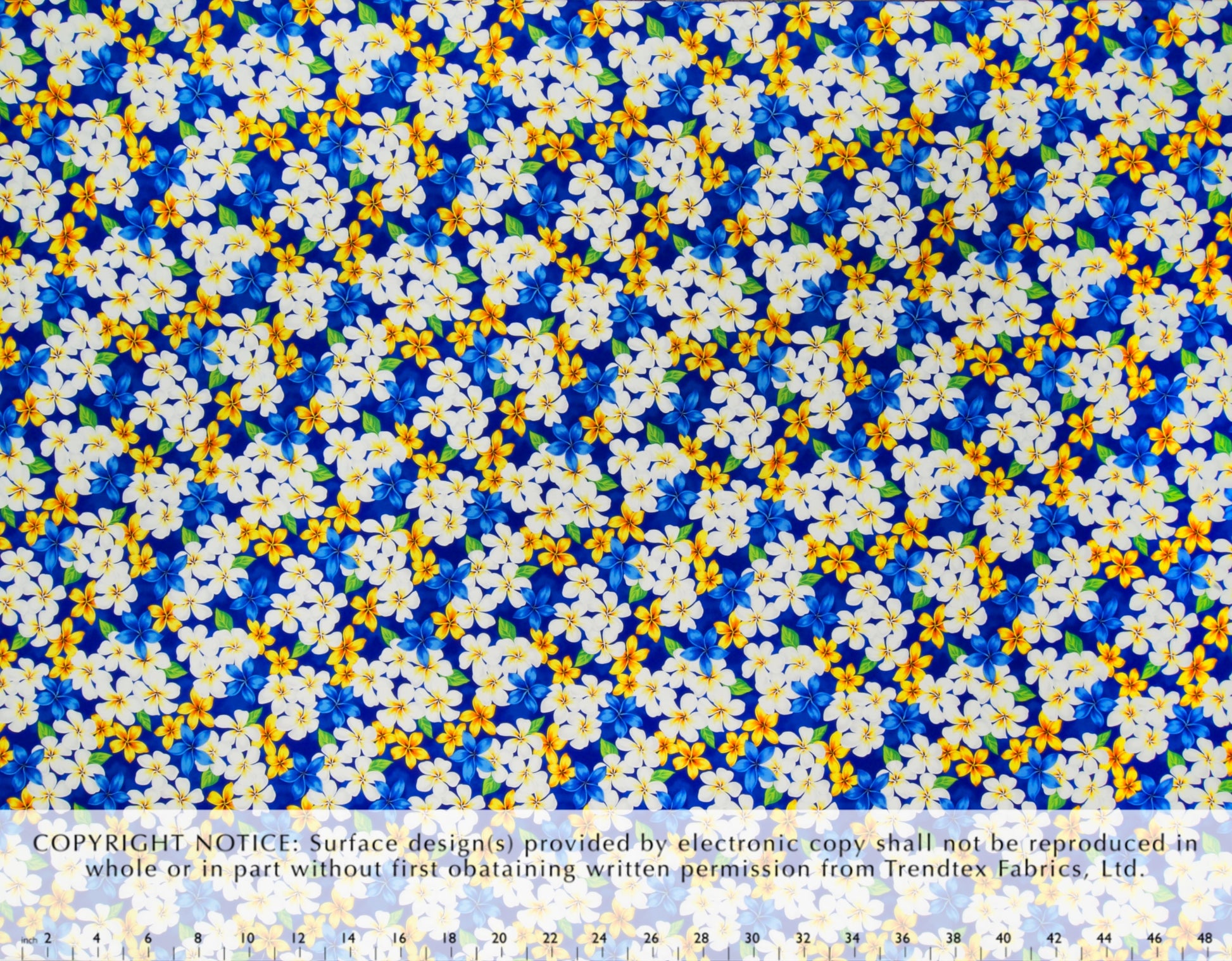 100% Cotton Manoa, 44/45"Wide, All-Over. Tropical Plumeria Flowers and Leaves on an Airbrushed Background.