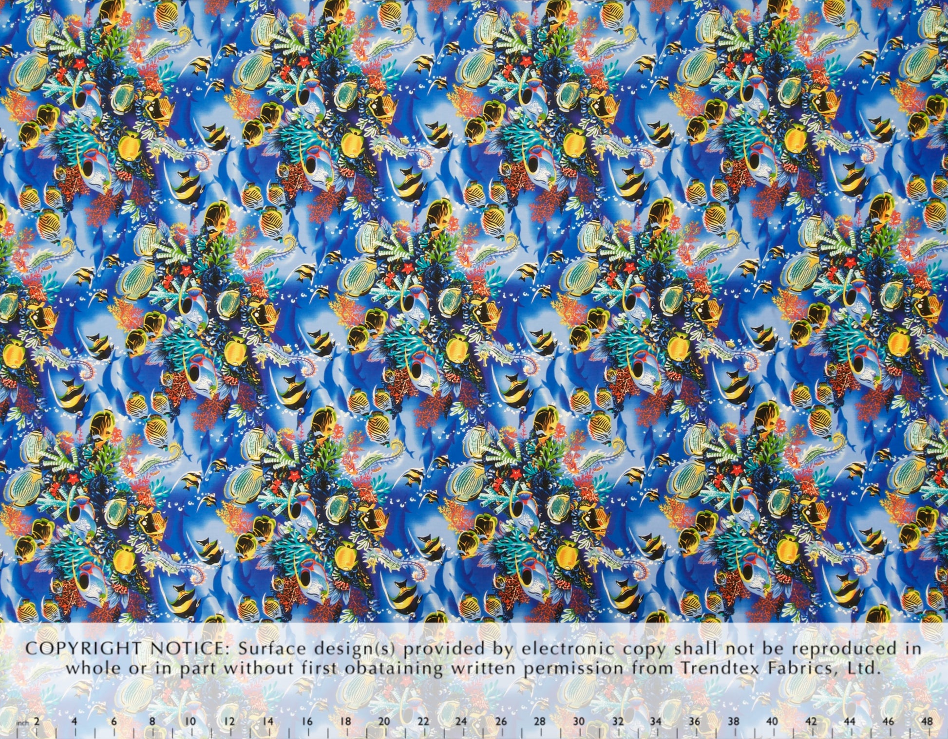 100% Cotton Poplin, 44/45"Wide, One-Way. Colorful Coral Reef with Fish, Seahorse, and Dolphins in Background.