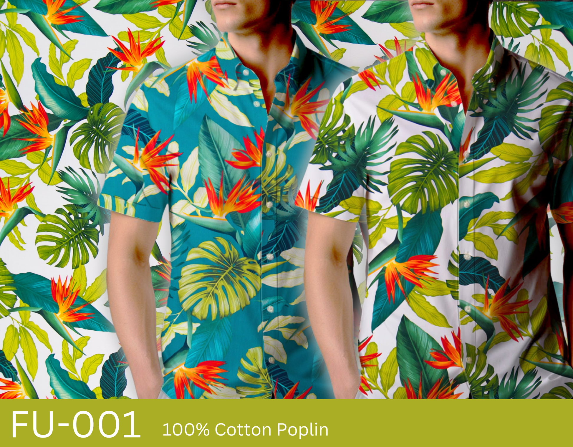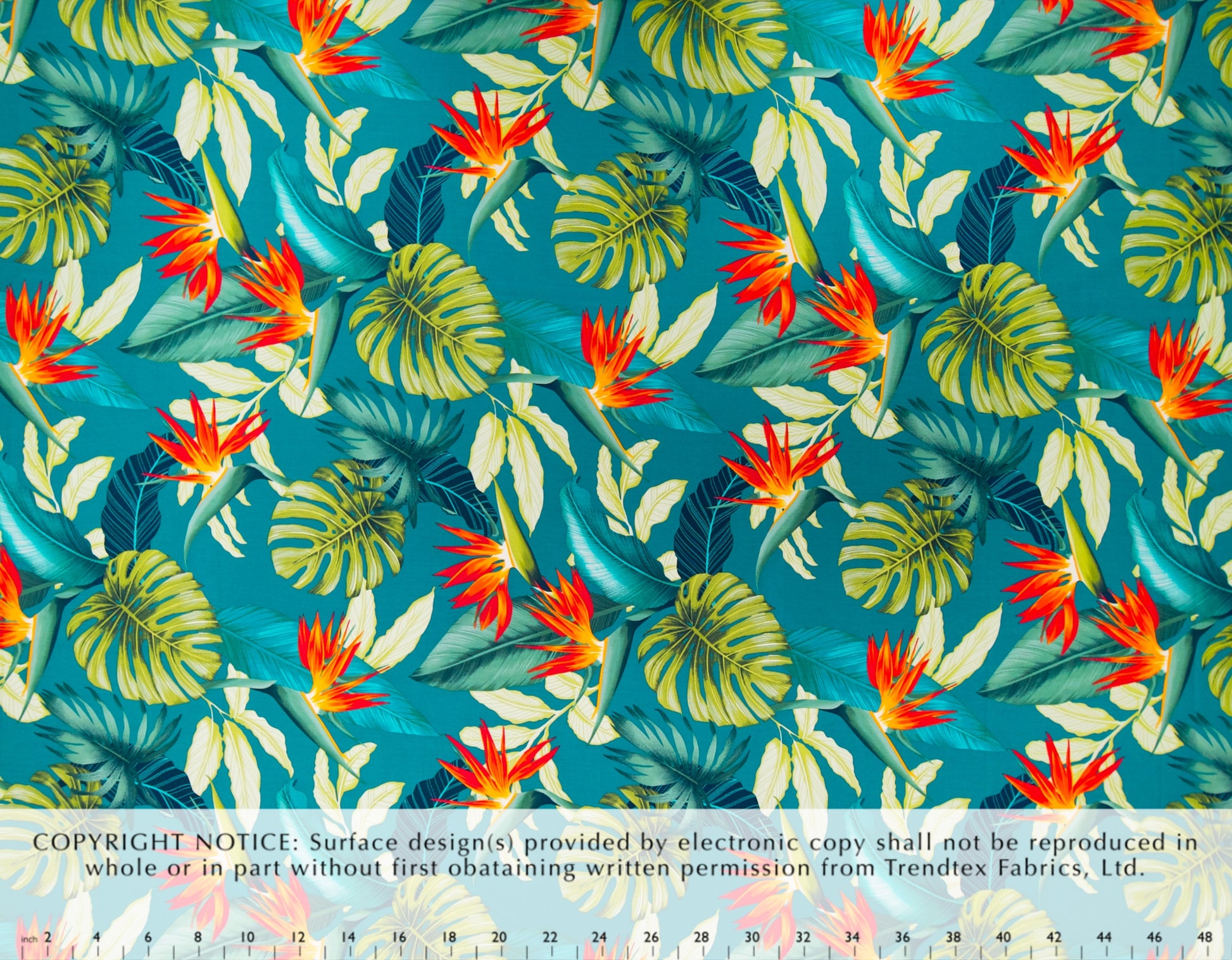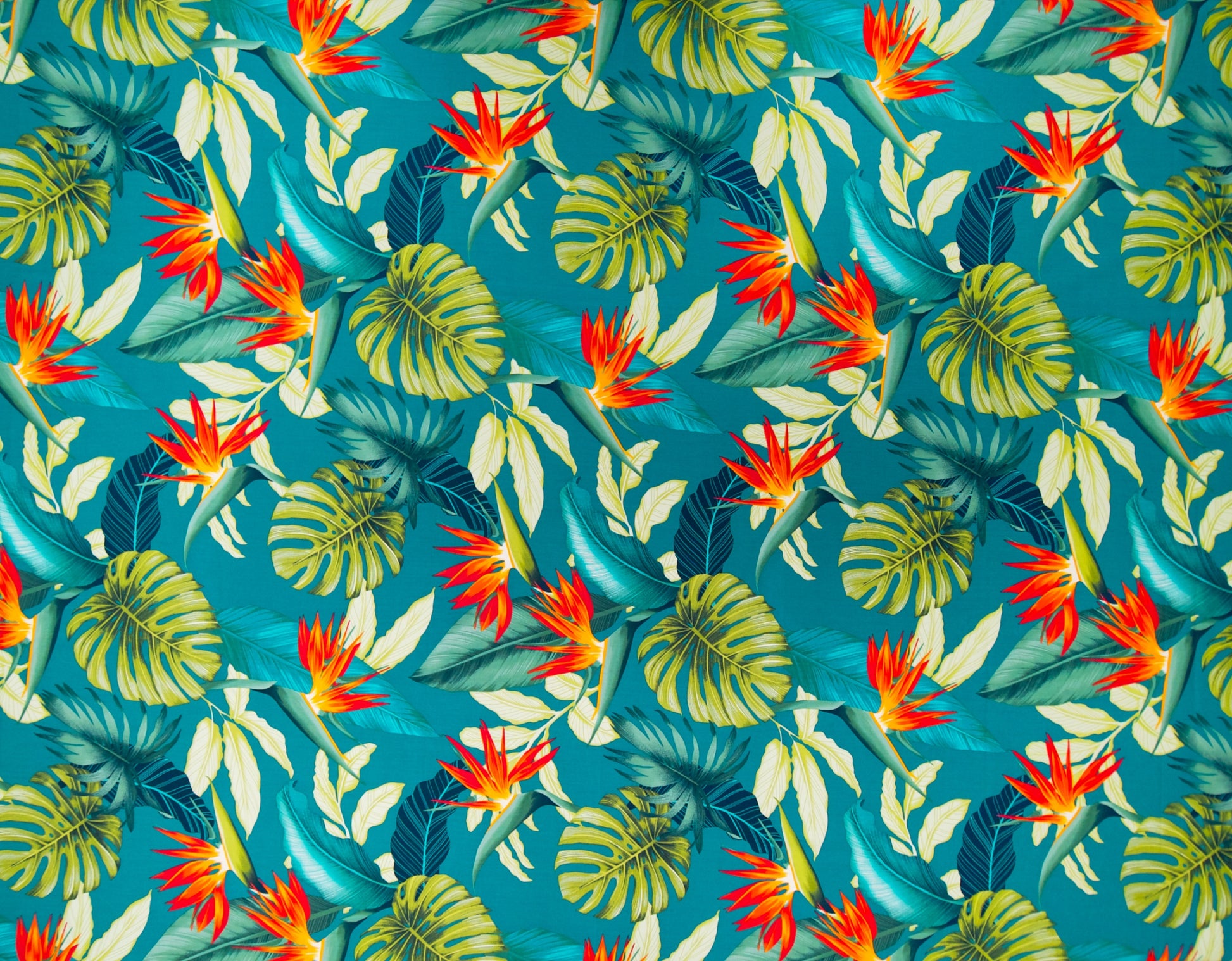 100% Cotton Poplin, 44/45" Wide, All Over. Bird of Paradise, Banana Leaves with Monstera Leaves