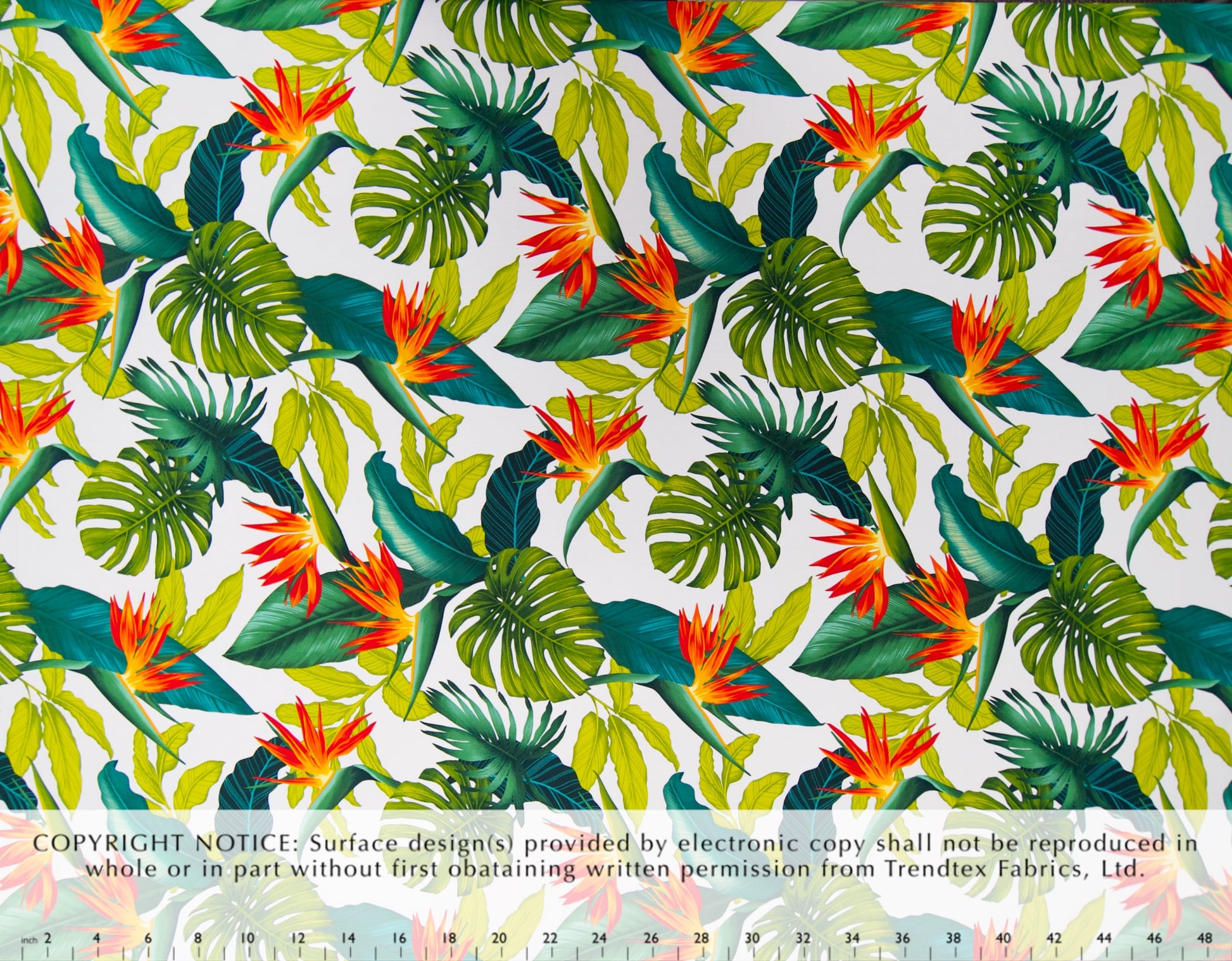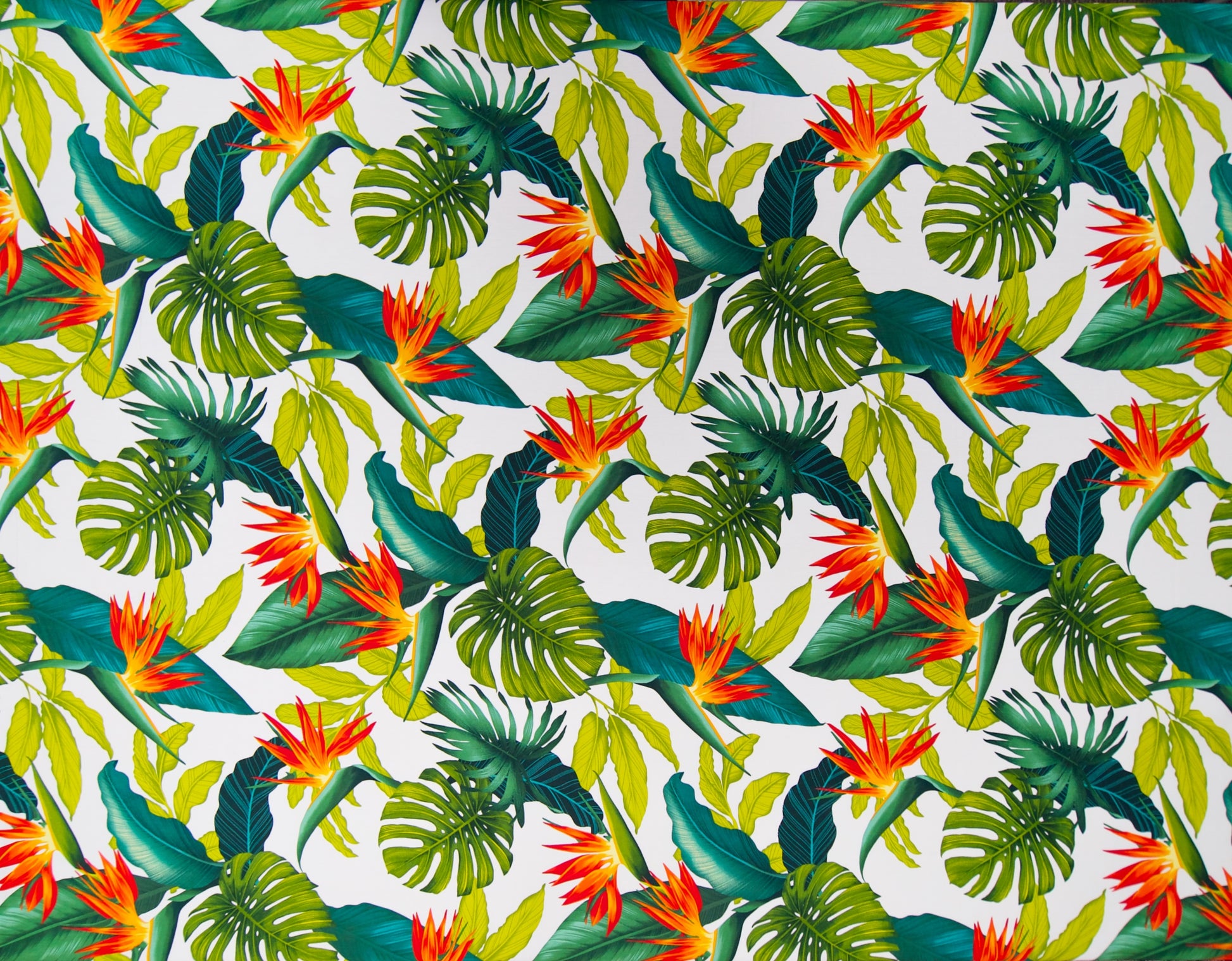 100% Cotton Poplin, 44/45" Wide, All Over. Bird of Paradise, Banana Leaves with Monstera Leaves