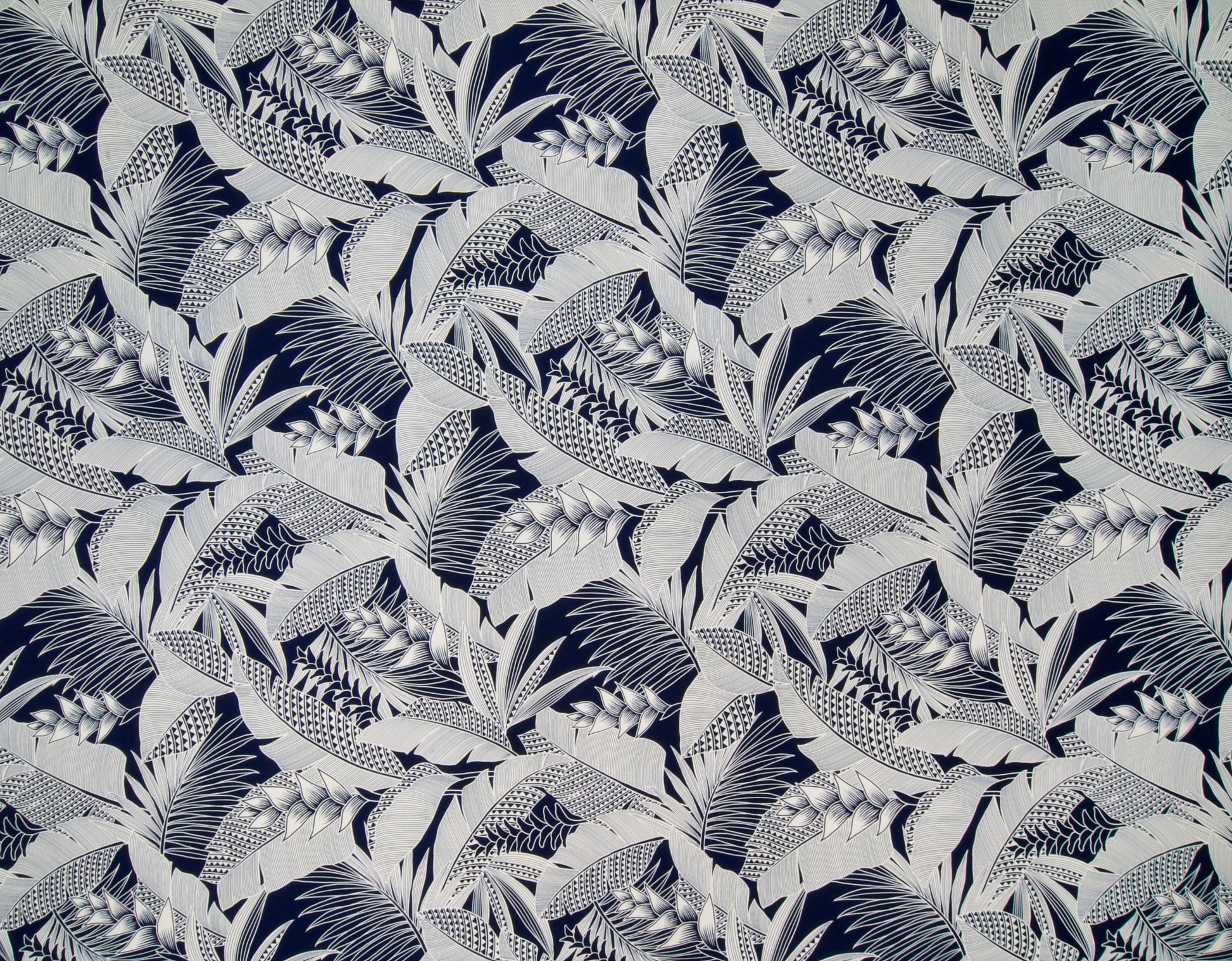 100% Rayon Poplin, 57" Wide, All-Over. Stylized Heliconia with Palm Leaves and Banana Leaves.