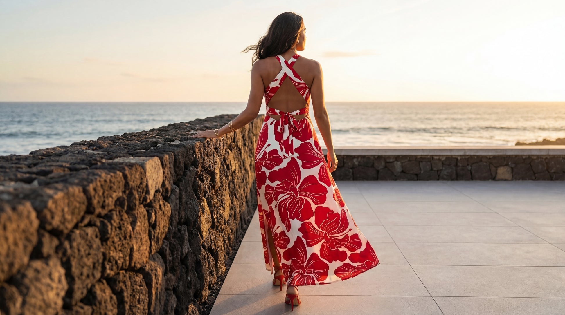 100% Rayon Poplin, 57" Wide, All-Over. Large Stylized Tropical Hibiscus Flower Motifs on a Solid Background.