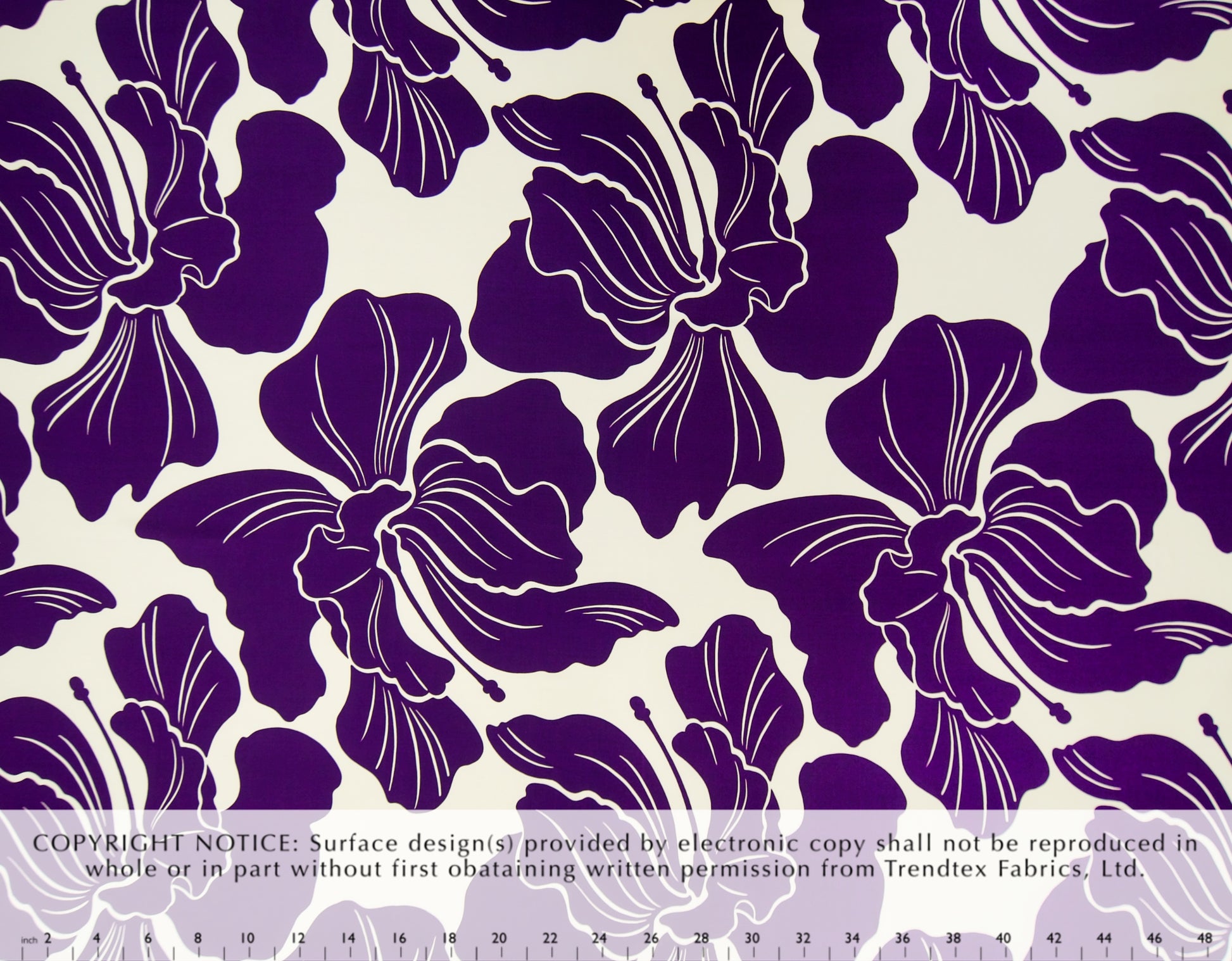 100% Rayon Poplin, 57" Wide, All-Over. Large Stylized Tropical Hibiscus Flower Motifs on a Solid Background.