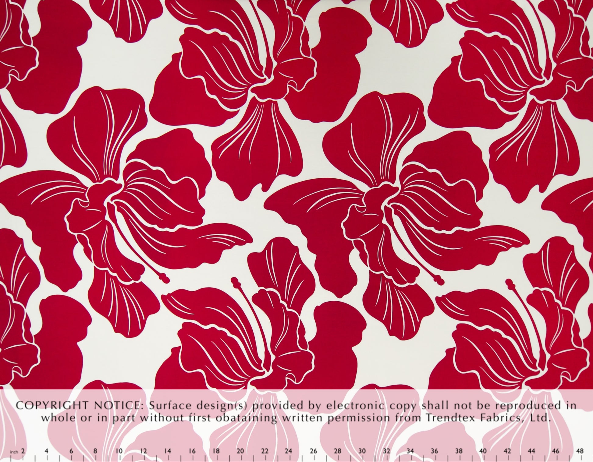 100% Rayon Poplin, 57" Wide, All-Over. Large Stylized Tropical Hibiscus Flower Motifs on a Solid Background.