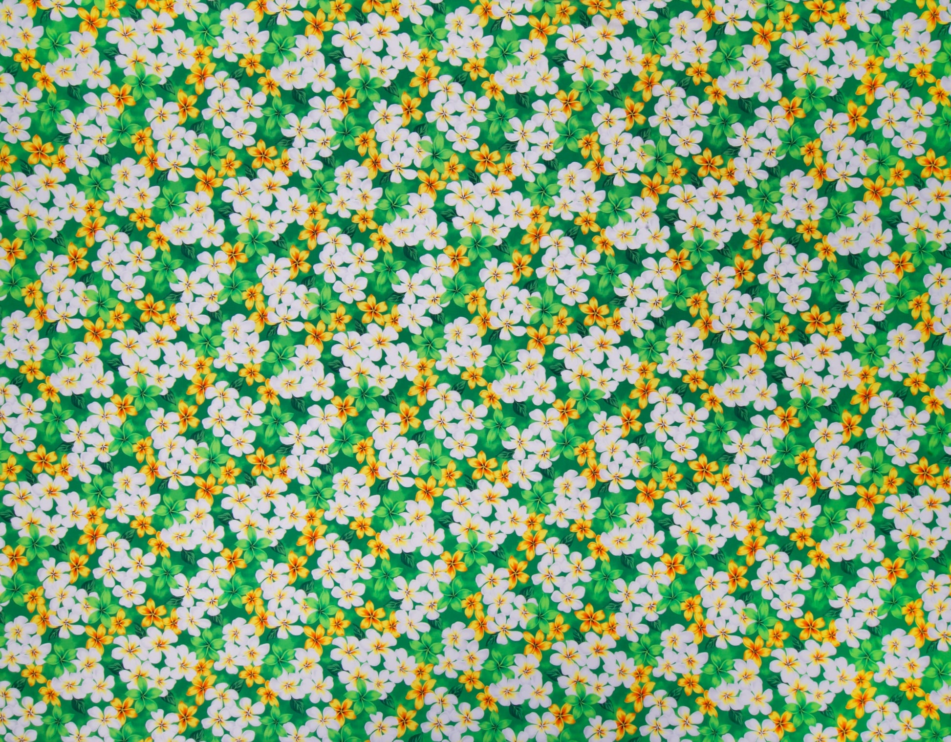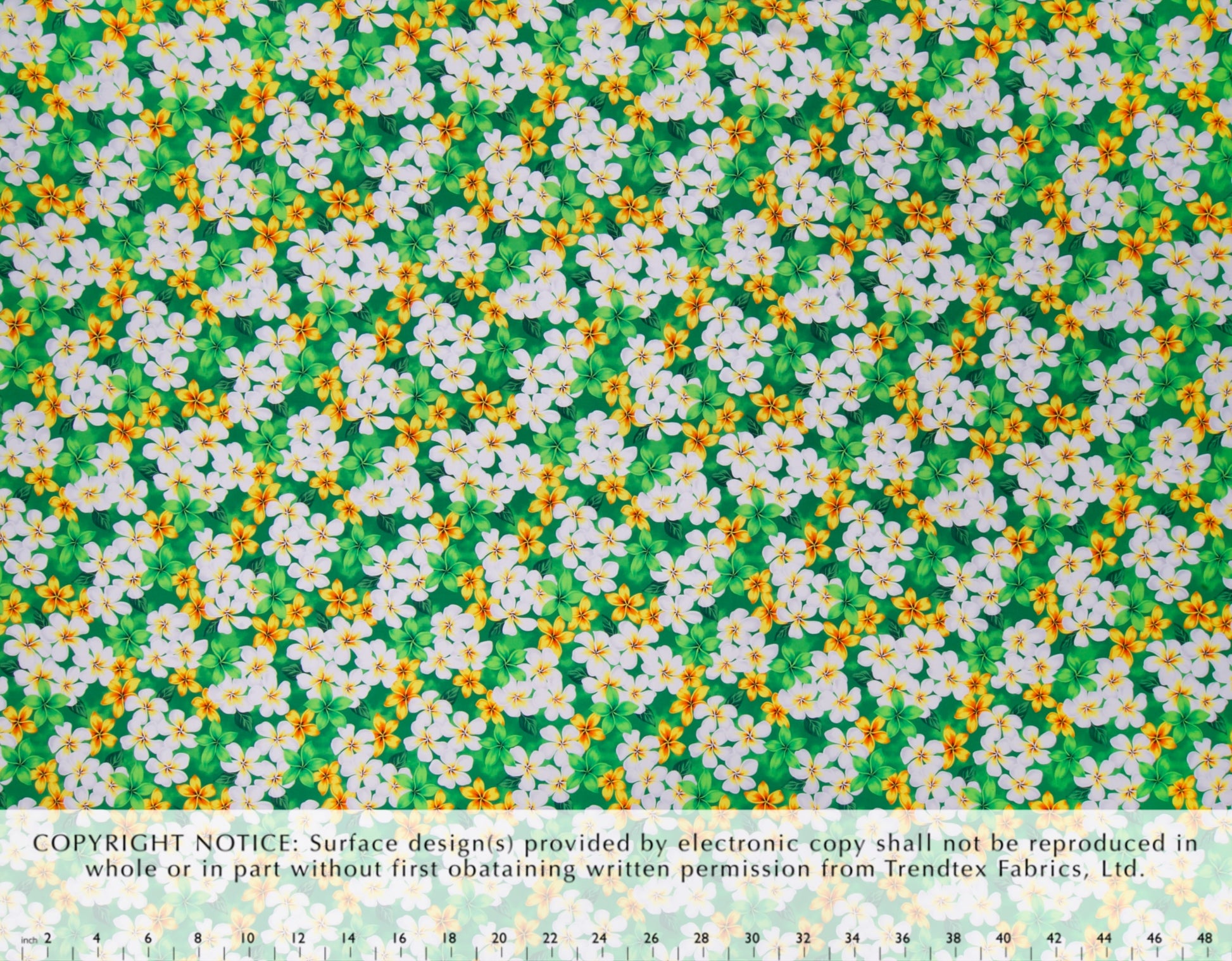 100% Cotton Manoa, 44/45"Wide, All-Over. Tropical Plumeria Flowers and Leaves on an Airbrushed Background.