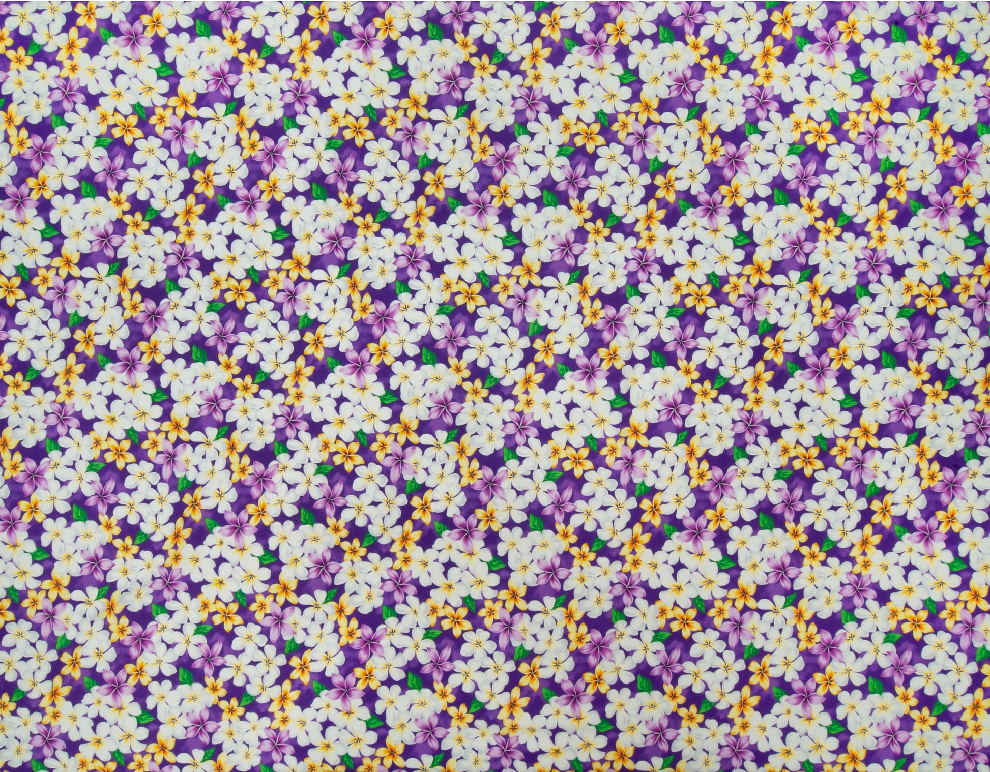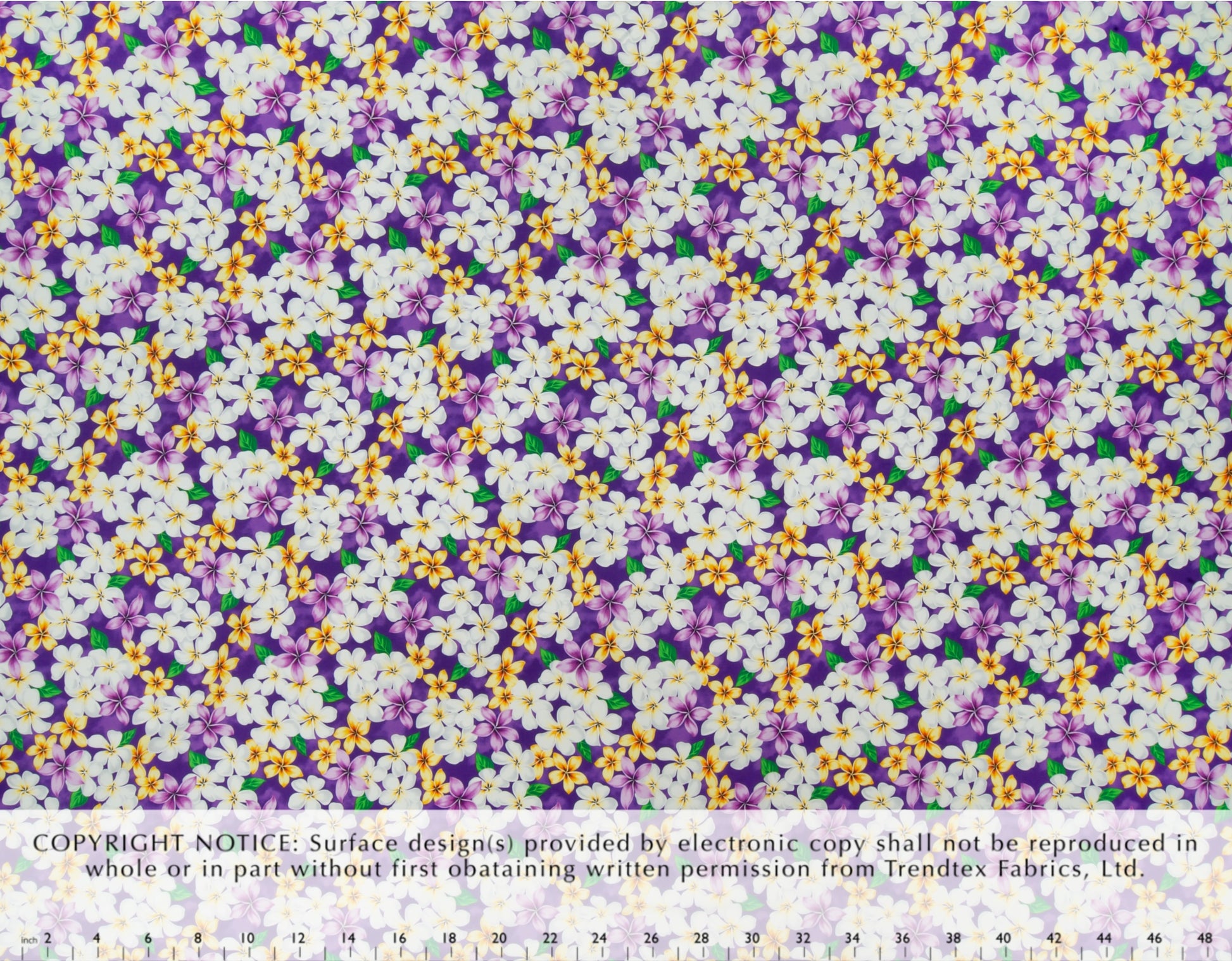 100% Cotton Poplin, 44/45"Wide, All-Over. Plumeria Flower Clusters on a Watercolor Background.