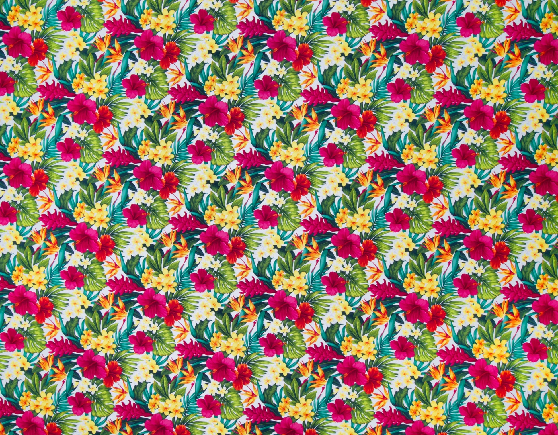 100% Cotton Manoa, 44/45"Wide, One- Way. Torch Ginger, Bird of Paradise, Hibiscus, and Plumeria Flowers with Tropical Leaves.