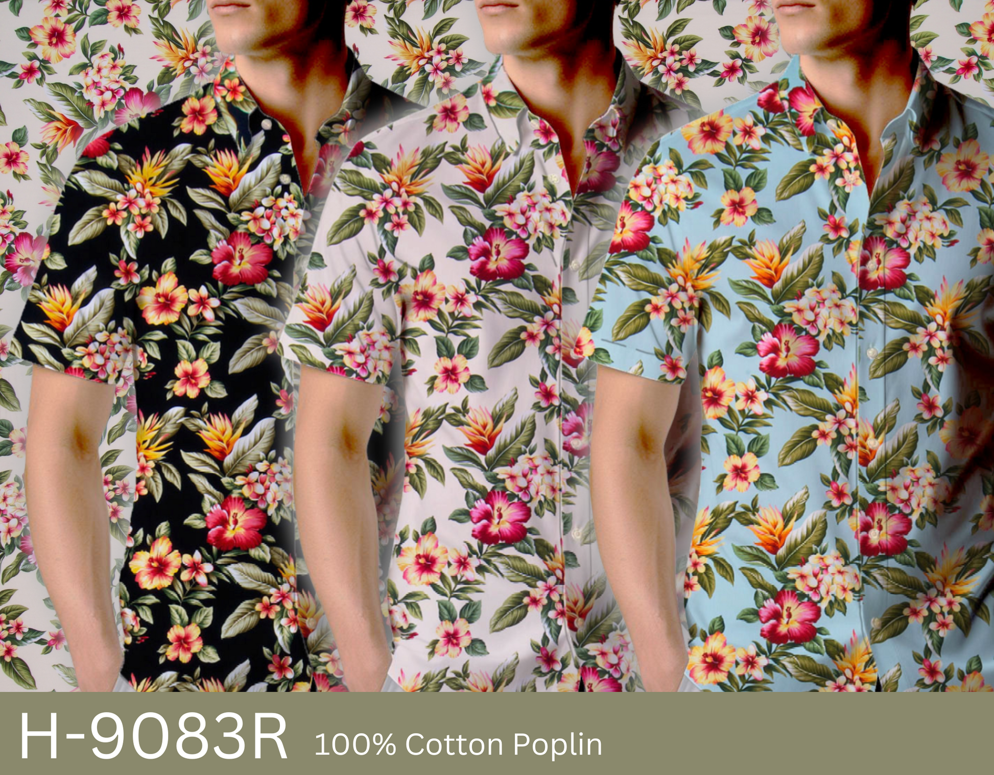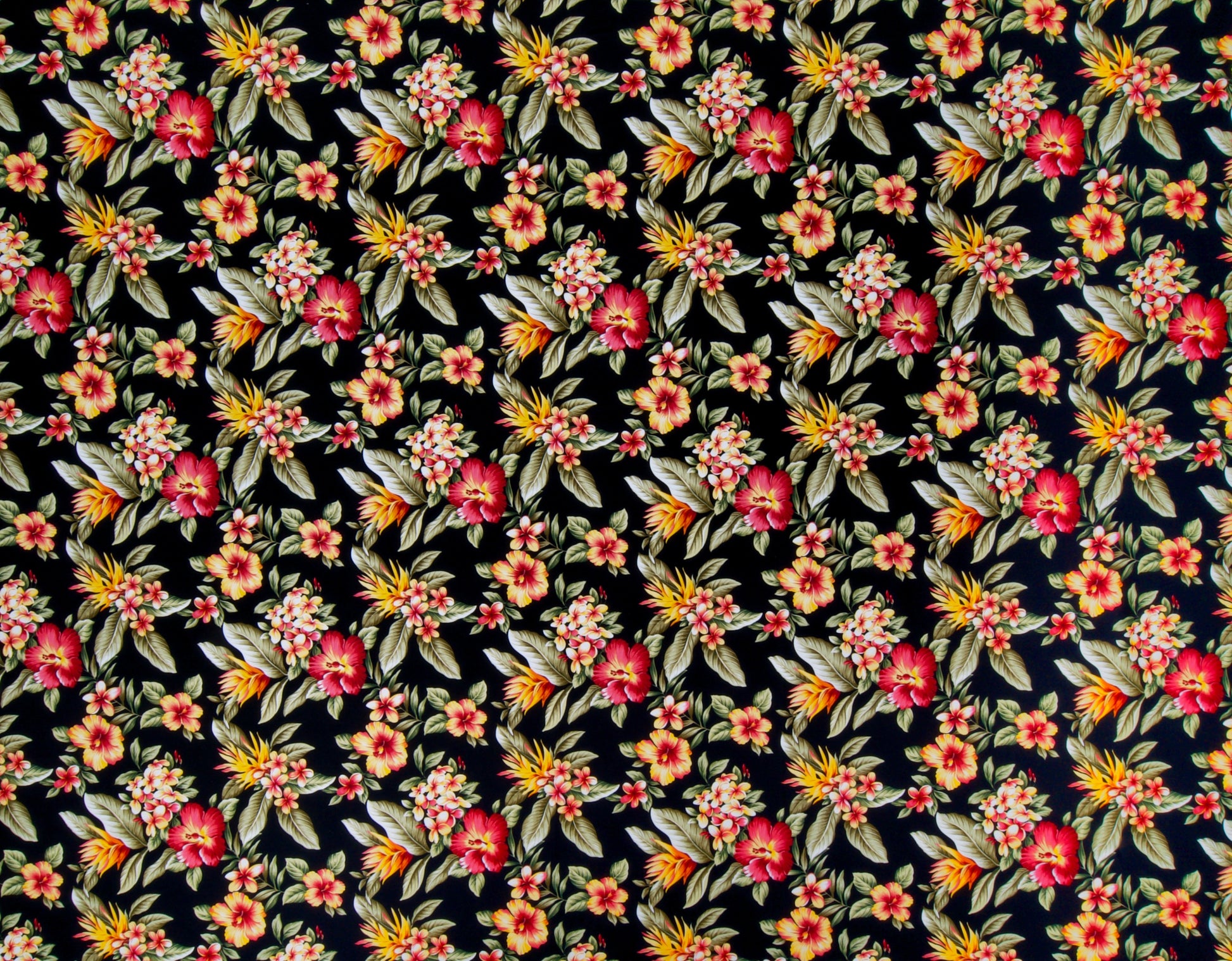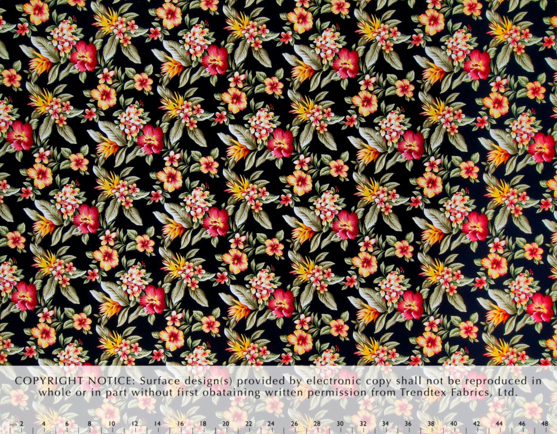 100% Cotton Poplin, 44/45"Wide, All-Over. Realistic Tropical Florals (Hibiscus, Plumeria, and Heliconia) Clustered All-Over with Leaves.
