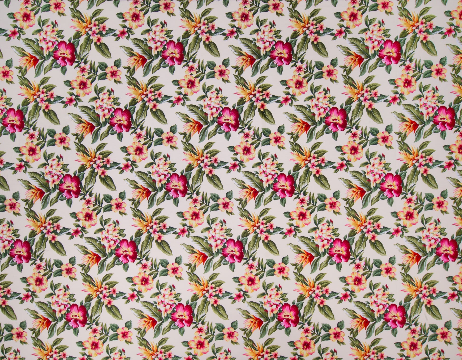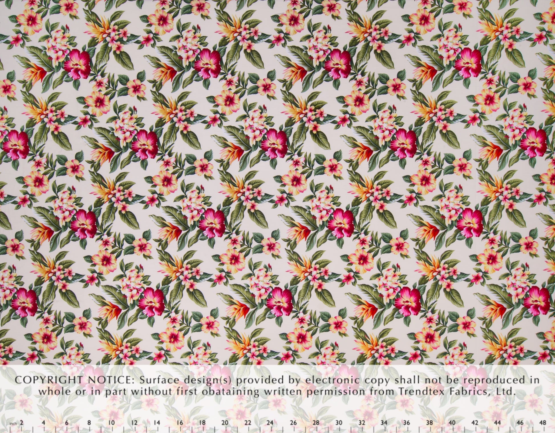 100% Cotton Poplin, 44/45"Wide, All-Over. Realistic Tropical Florals (Hibiscus, Plumeria, and Heliconia) Clustered All-Over with Leaves.