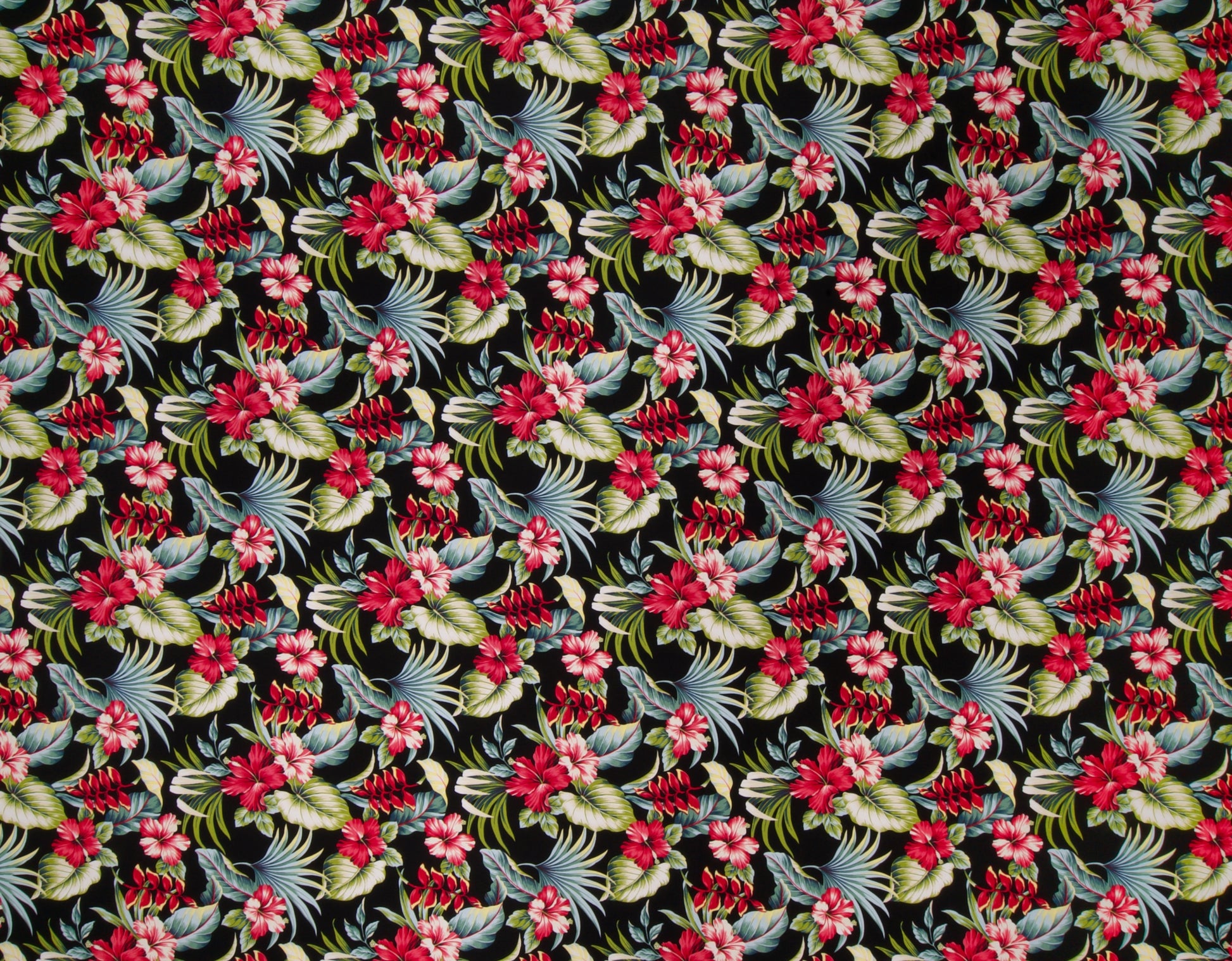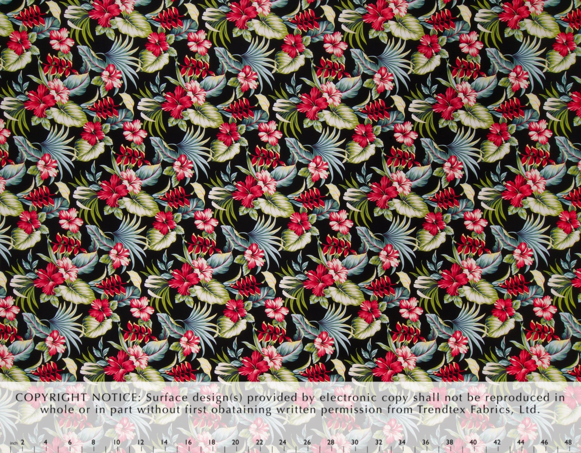 100% Cotton Poplin, 44/45"Wide, All-Over. Realistic Hibiscus and Heliconia Flowers on Tropical Leaves.