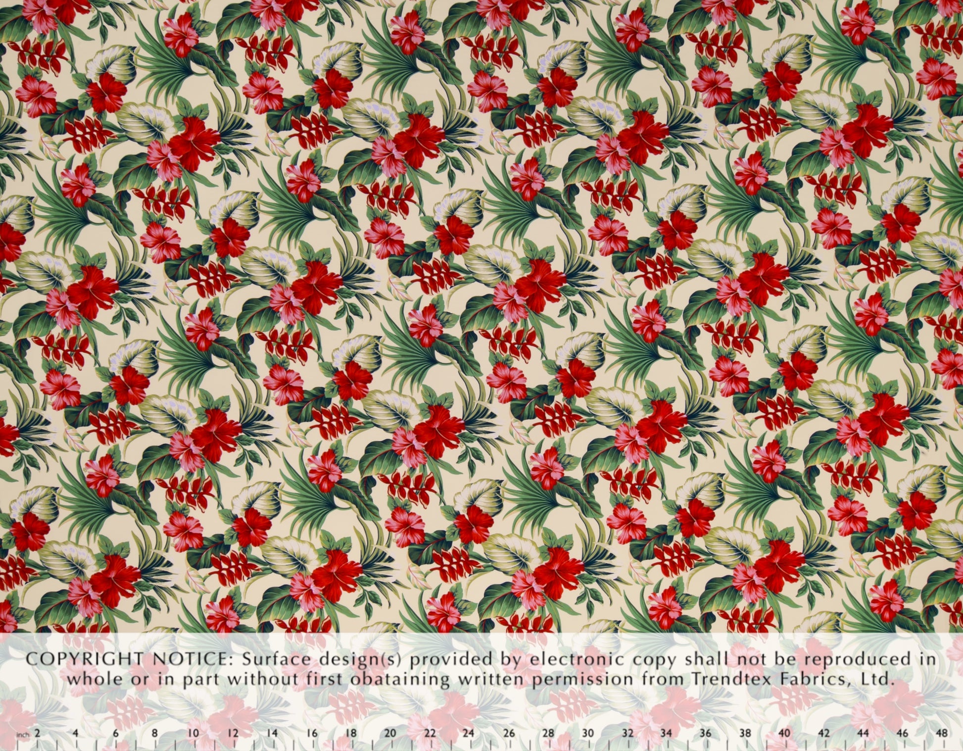 100% Cotton Poplin, 44/45"Wide, All-Over. Realistic Hibiscus and Heliconia Flowers on Tropical Leaves.
