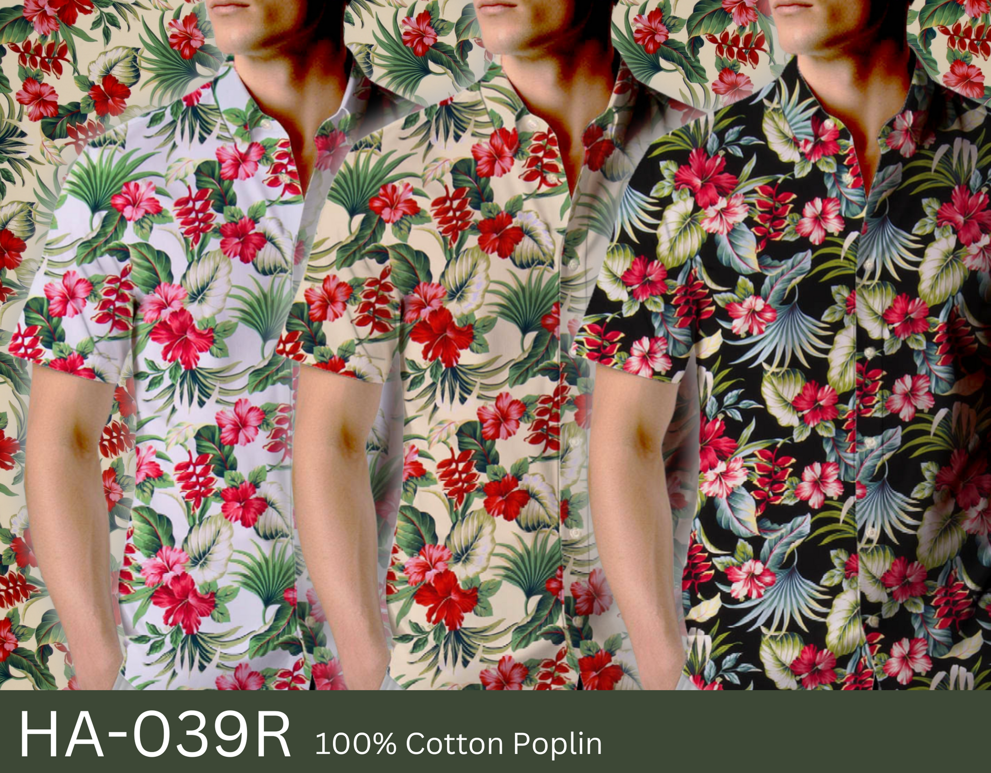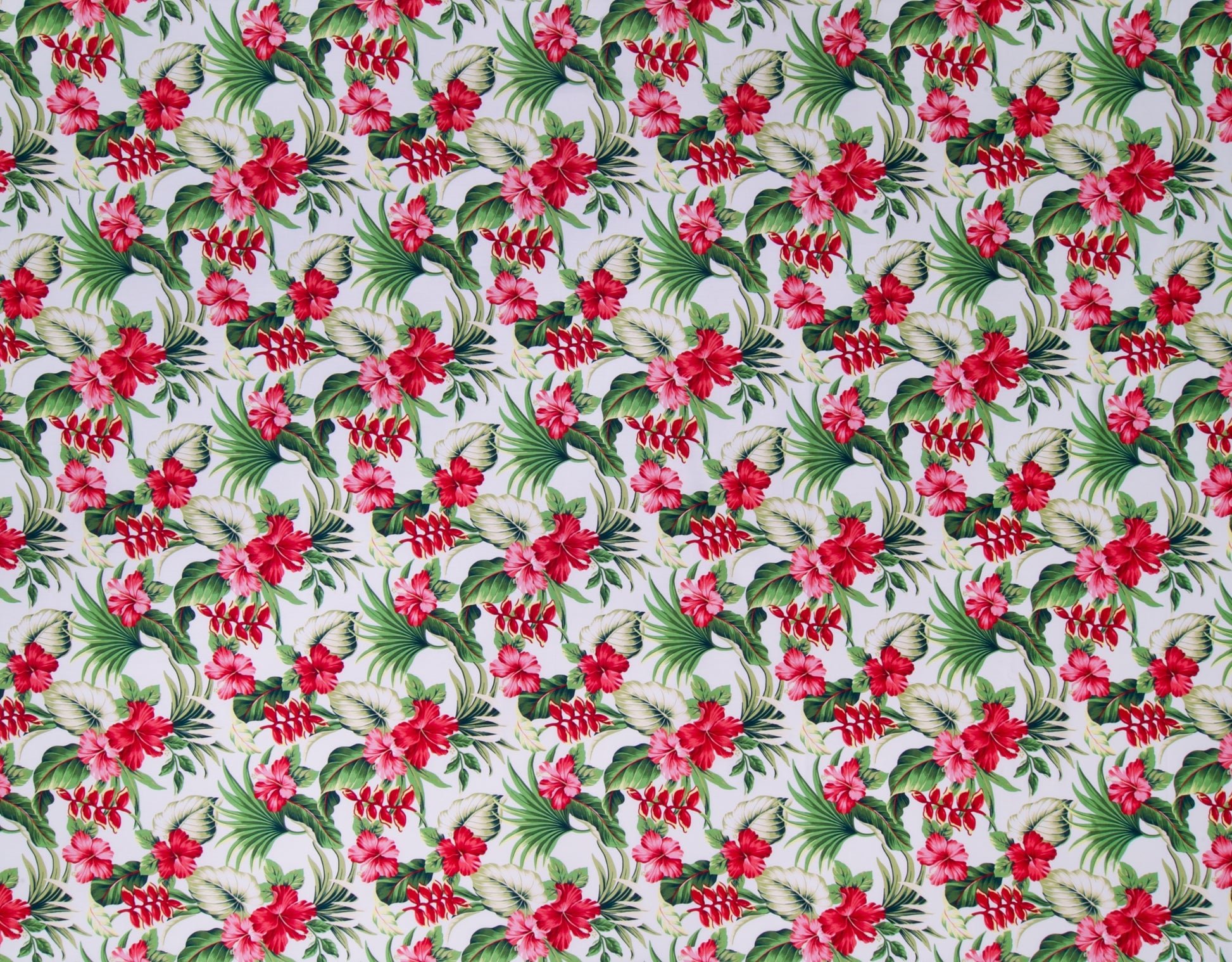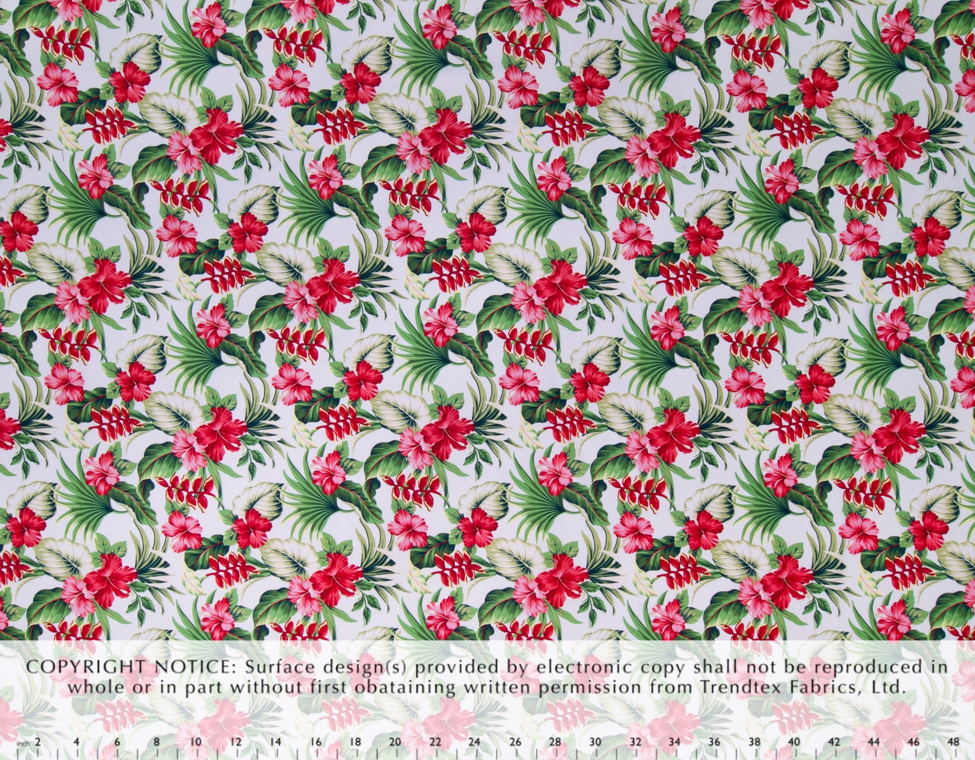 100% Cotton Poplin, 44/45"Wide, All-Over. Realistic Hibiscus and Heliconia Flowers on Tropical Leaves.