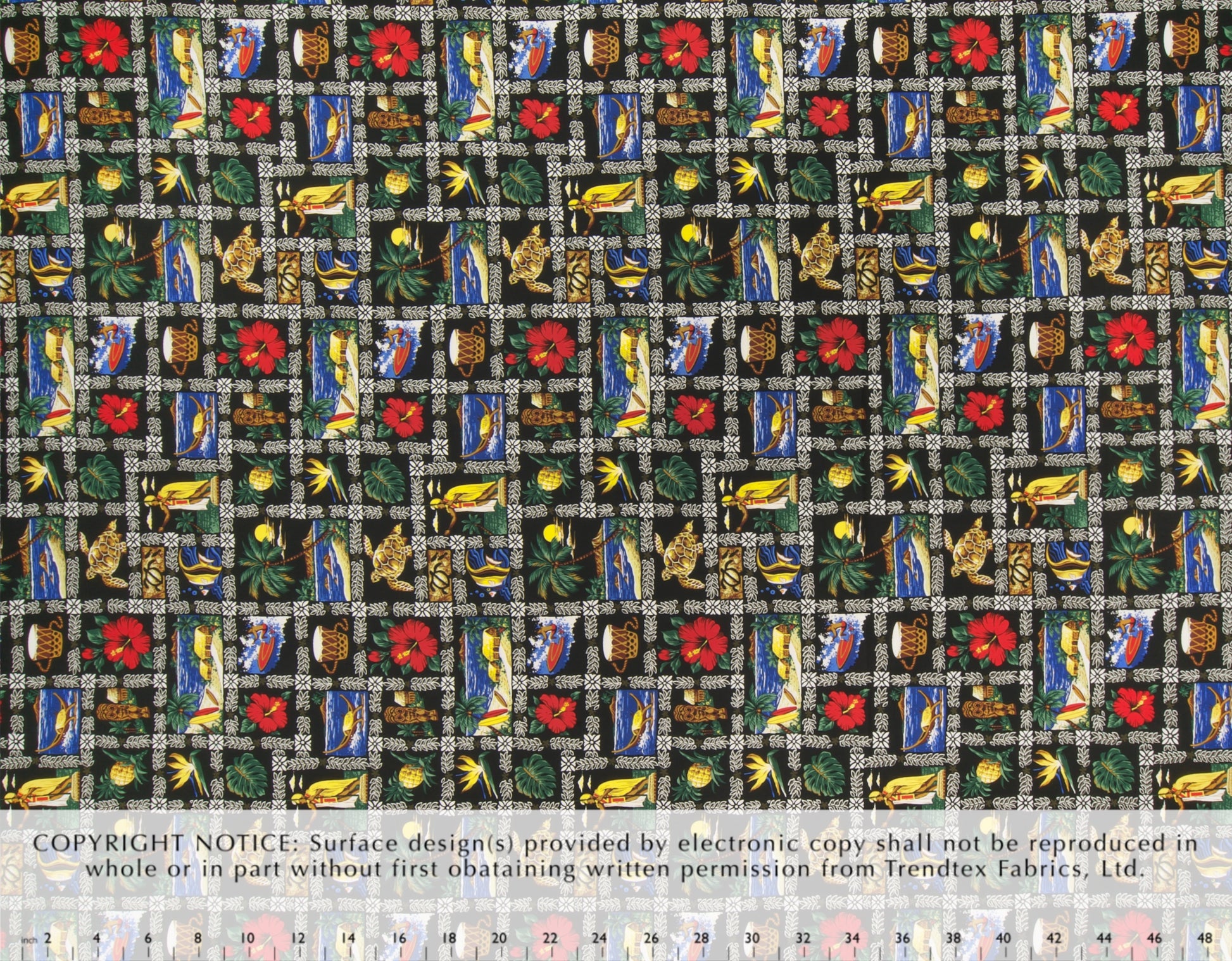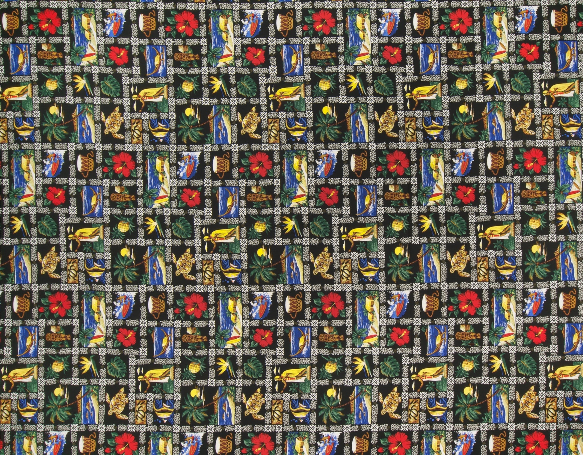 100% Cotton Poplin, 44/45"Wide, All-Over. Hawaiian Scenic Block Print.