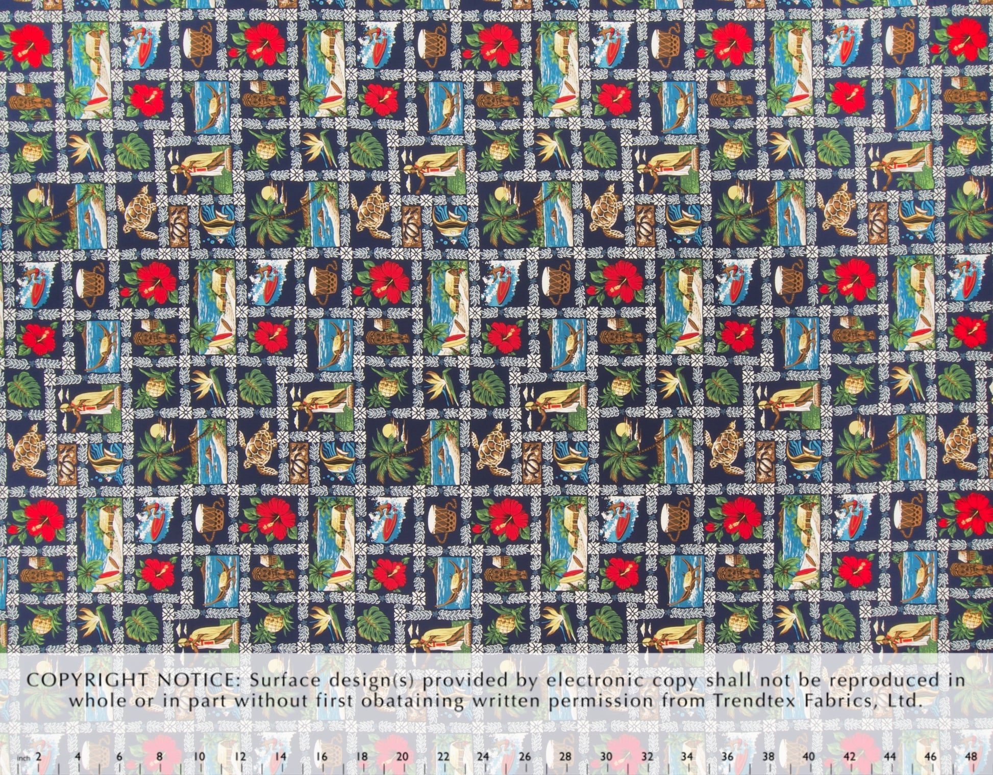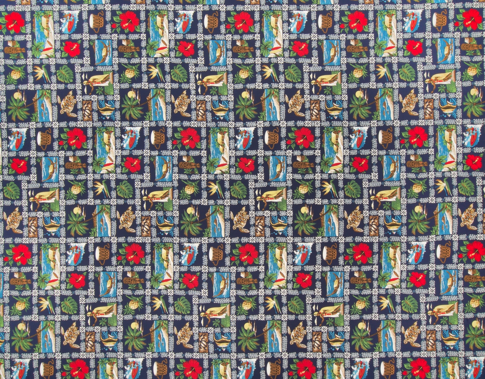 100% Cotton Poplin, 44/45"Wide, All-Over. Hawaiian Scenic Block Print.