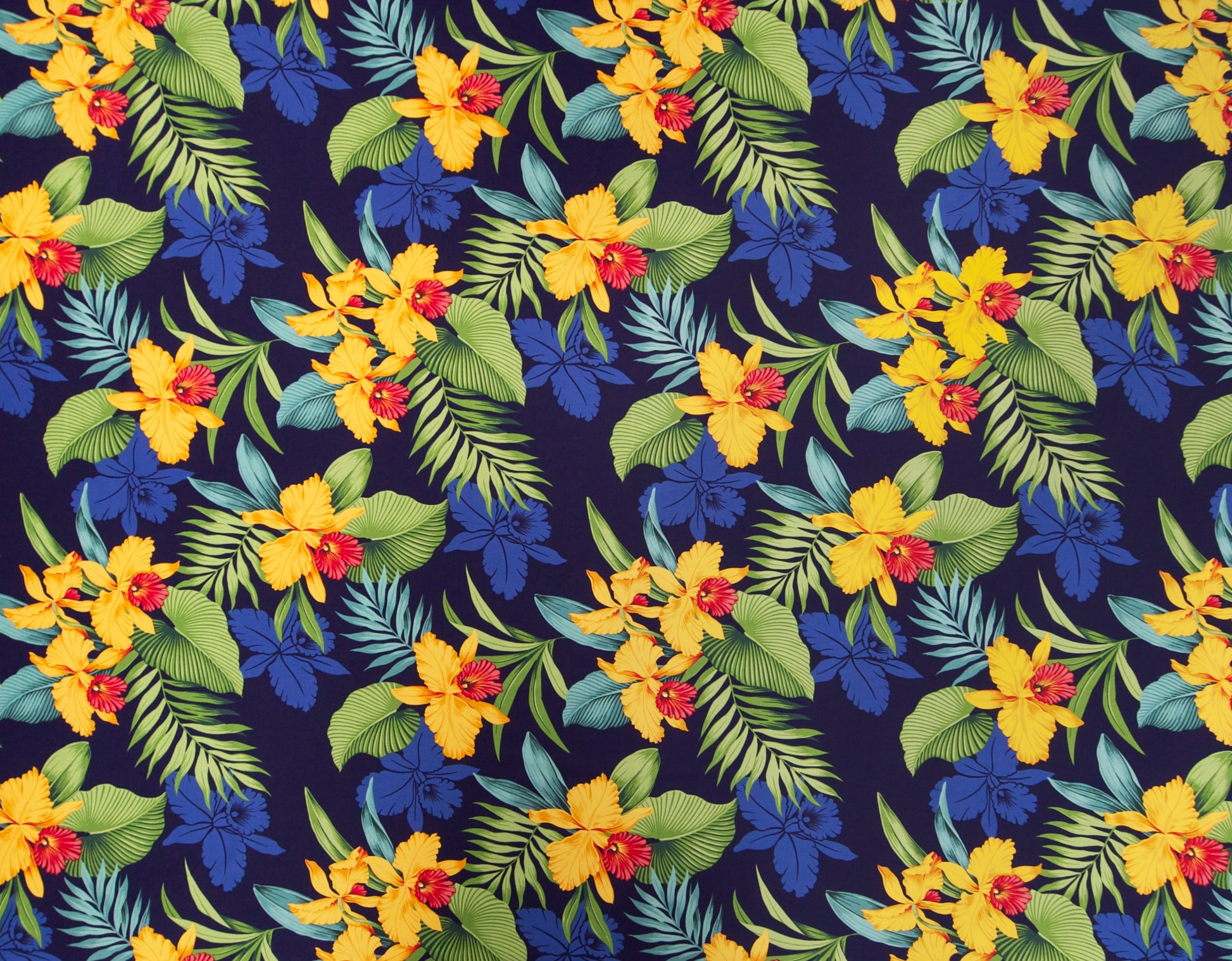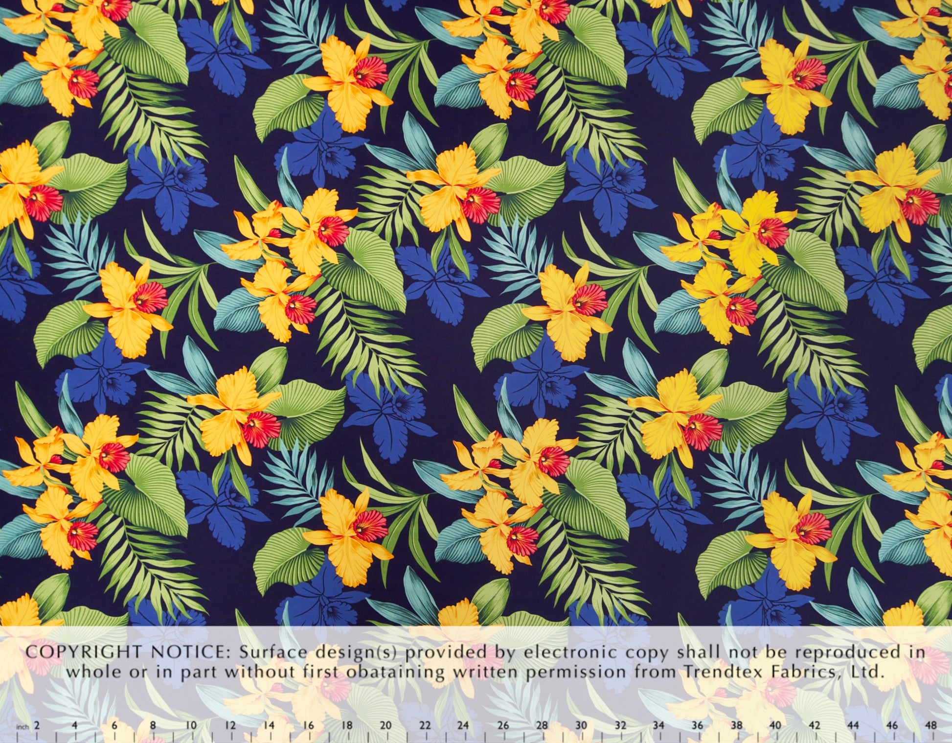 100% Cotton Poplin, 44/45"Wide, One-Way. Clusters of Realistic Orchids and Tropical Leaves on a Background of Tonal Orchids.