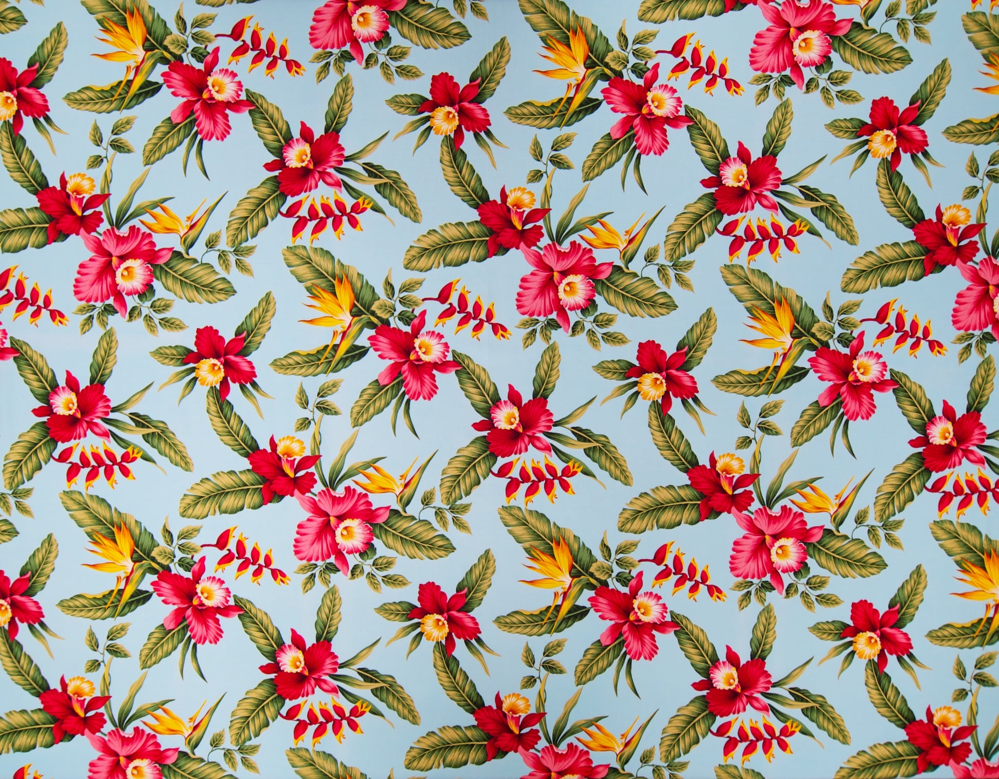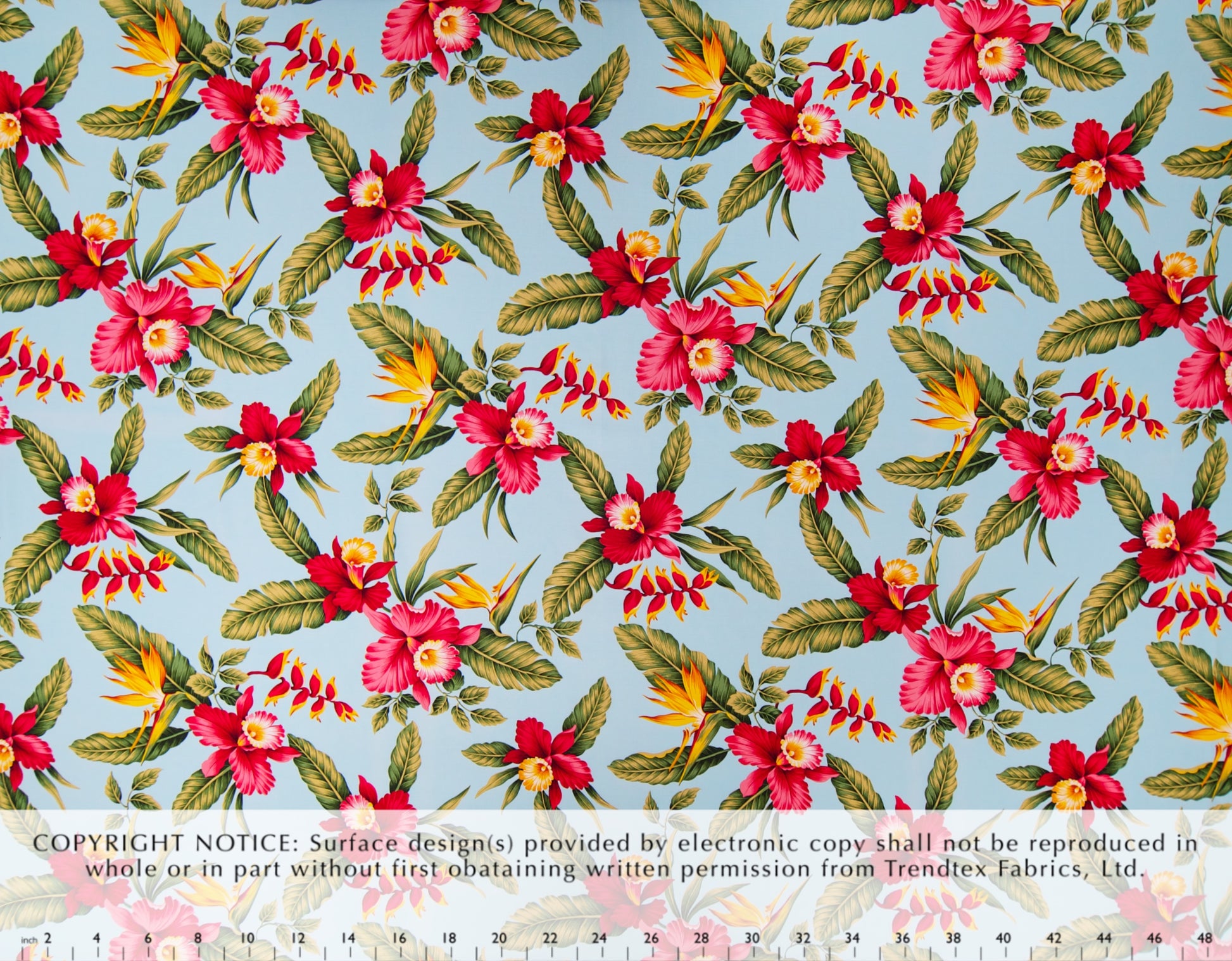 100% Rayon Poplin, 57" Wide, Realistic Orchids and Bird of Paradise with Heliconia.