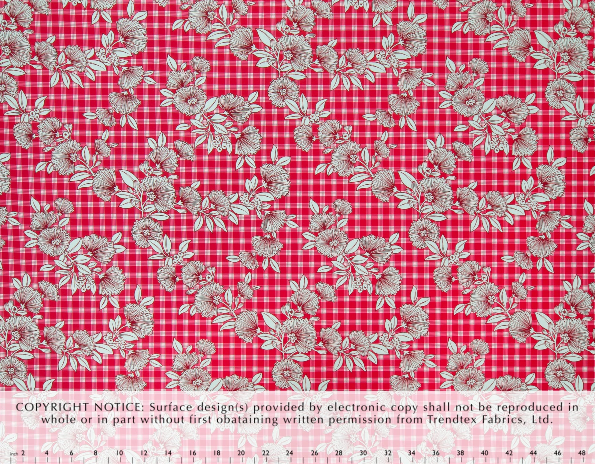 100% Cotton Poplin, 44/45"Wide, All-Over. Stylized Artistic Ohia Lehua Flowers on a Background of Palaka.