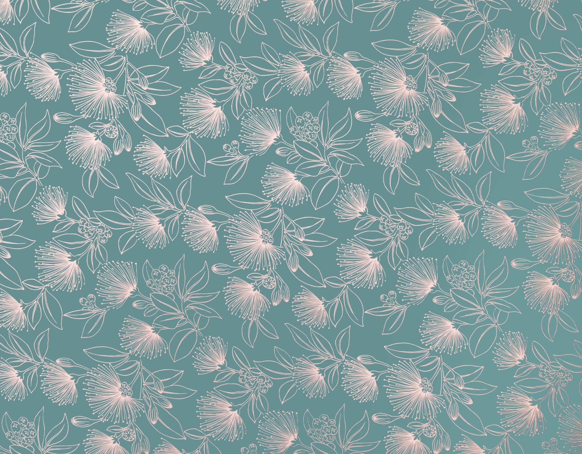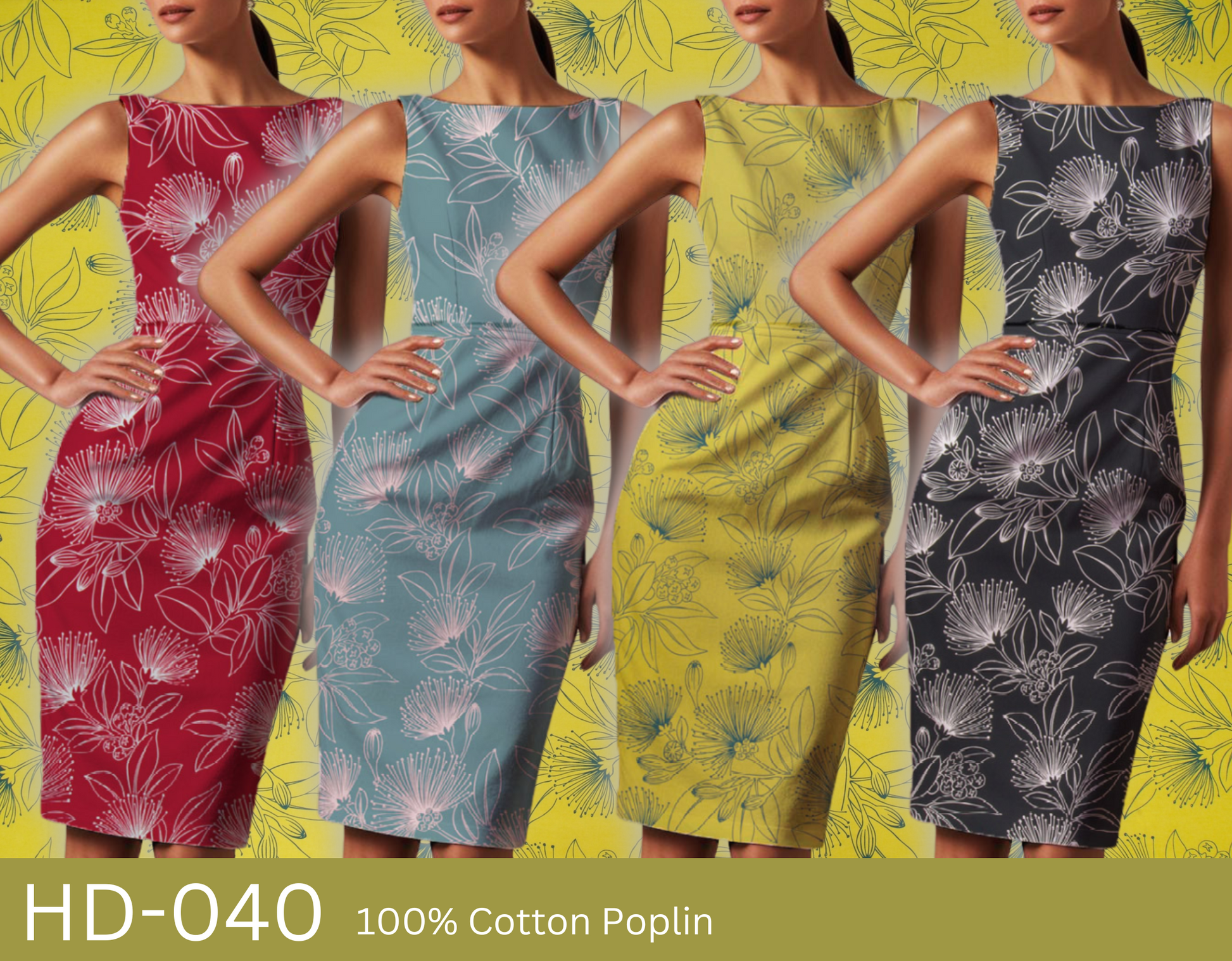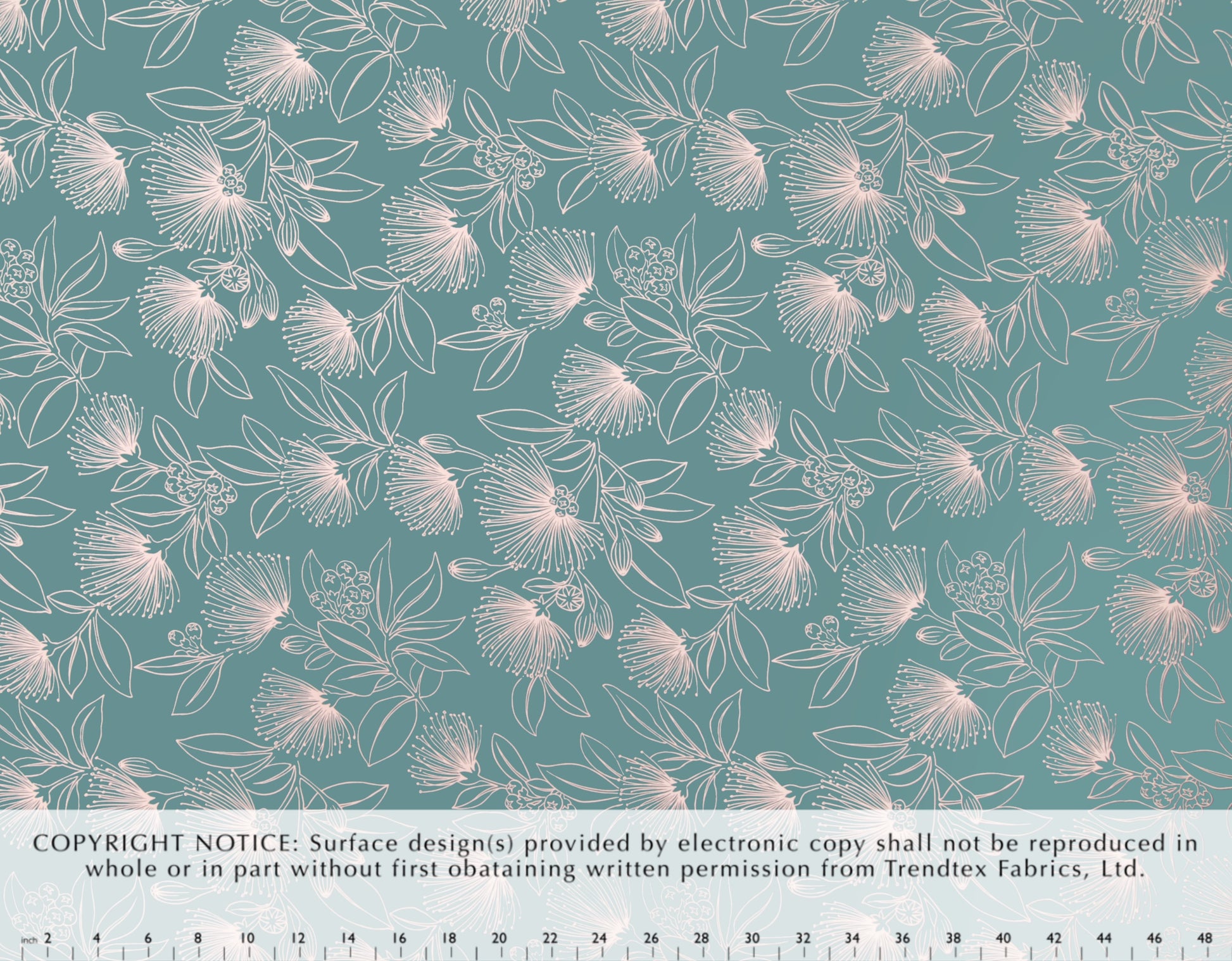 100% Cotton Poplin, 44/45"Wide, One-Way. Stylized Outline Ohia Lehua Blossoms.