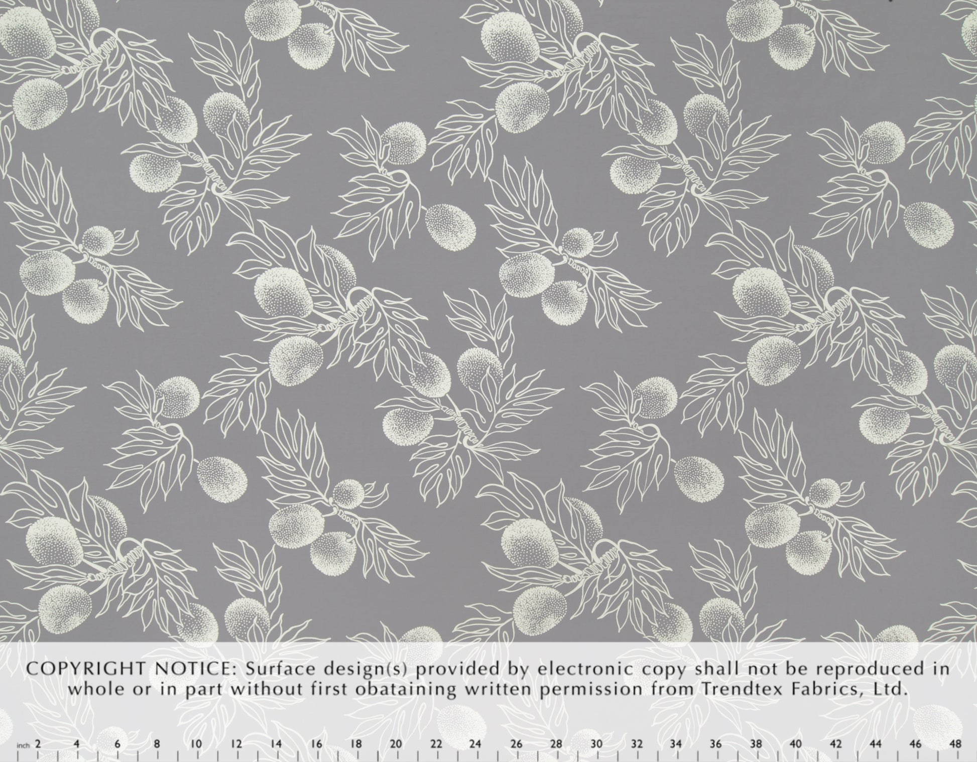100% Cotton Poplin, 44/45"Wide, All-Over. Stylized Ulu (Breadfruit) on a Solid Background.