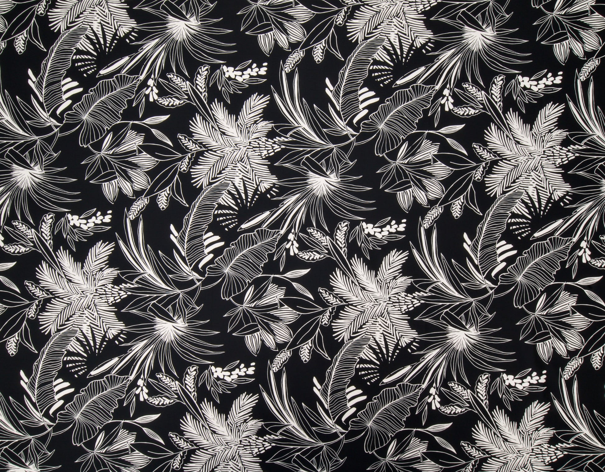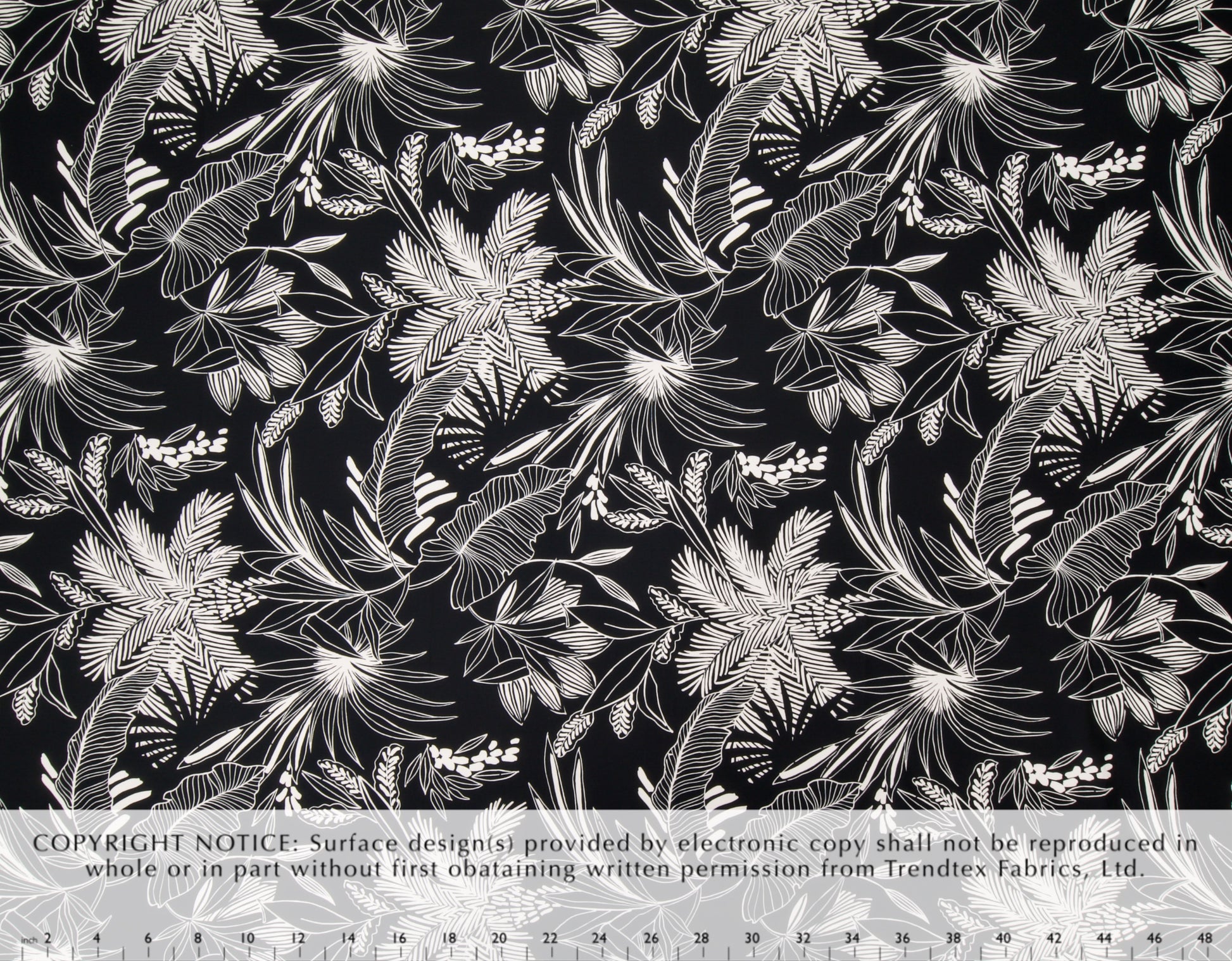 100% Cotton Poplin, 44/45"Wide, One-Way. Stylized Palm Trees and Tropical Leaves.