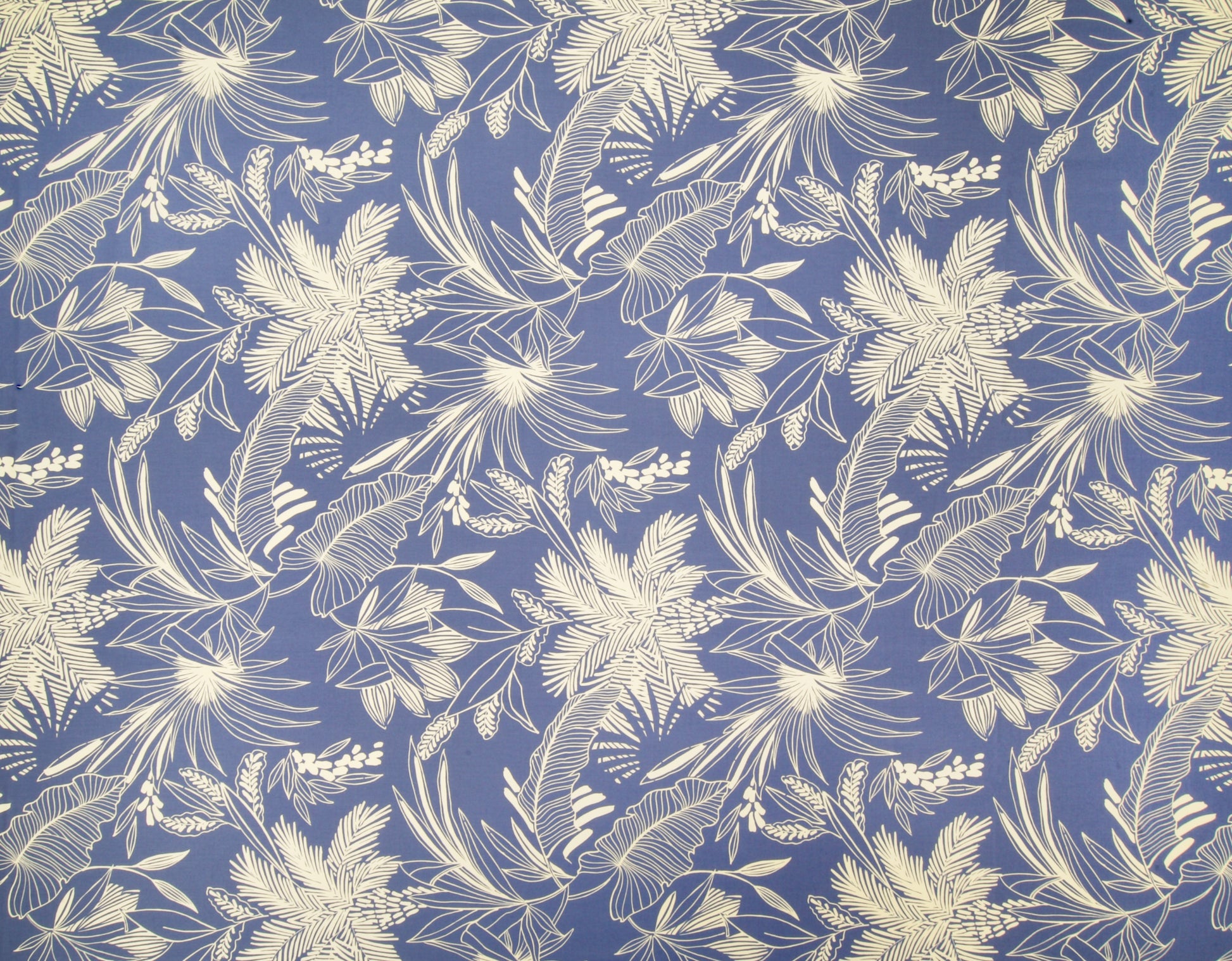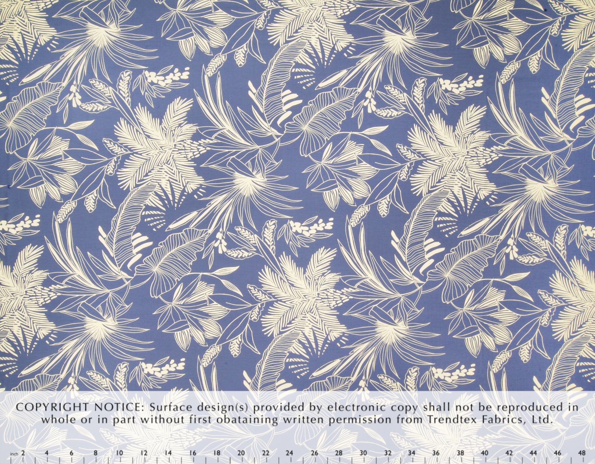 100% Cotton Poplin, 44/45"Wide, One-Way. Stylized Palm Trees and Tropical Leaves.