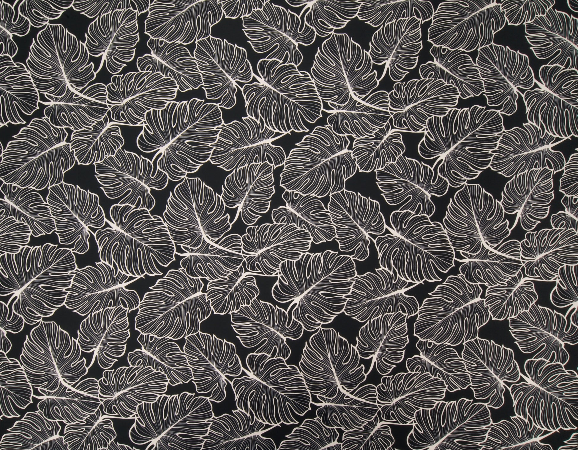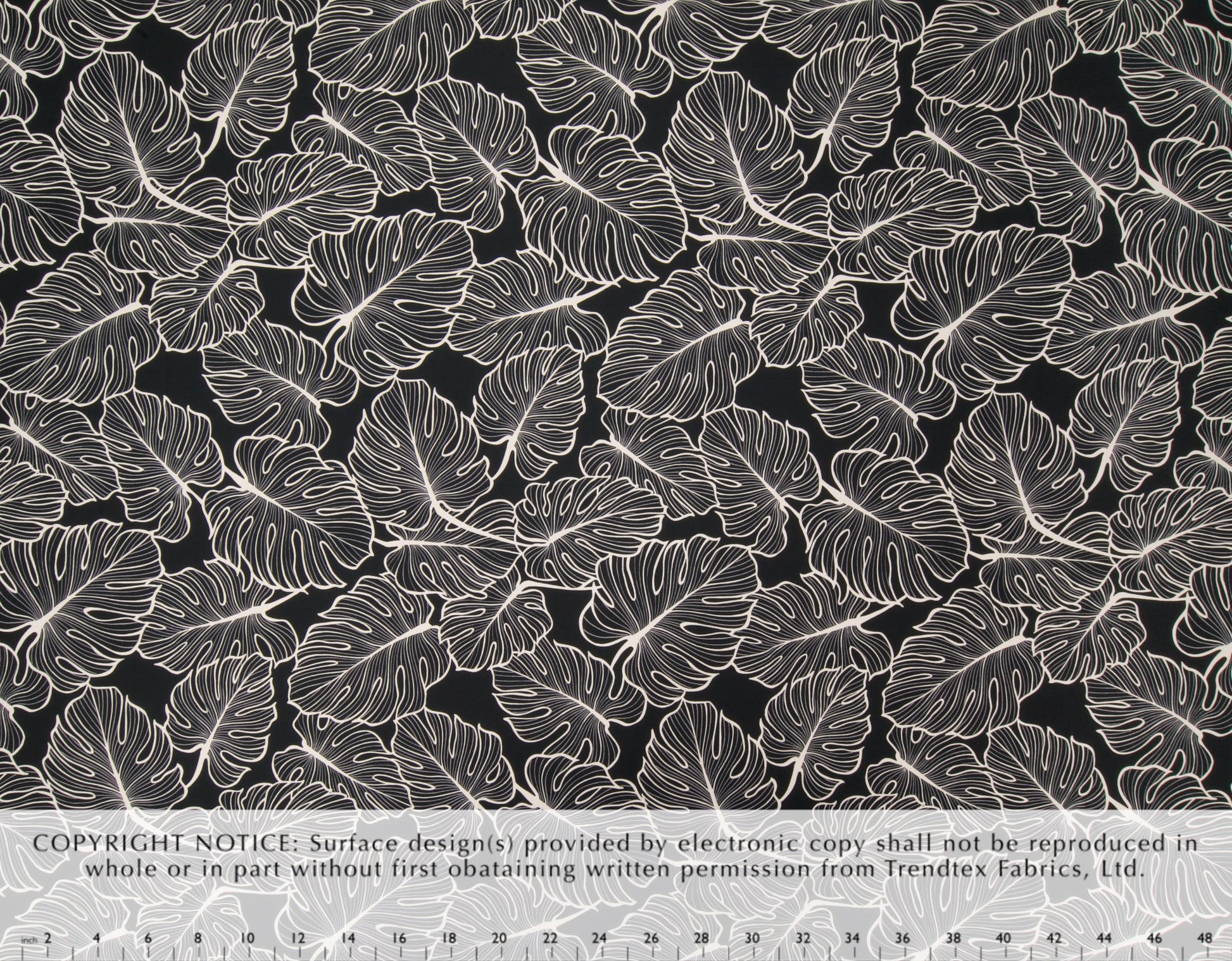 100% Cotton Poplin, 44/45"Wide, All-Over. Stylized Linework Tropical Monstera Leaves.