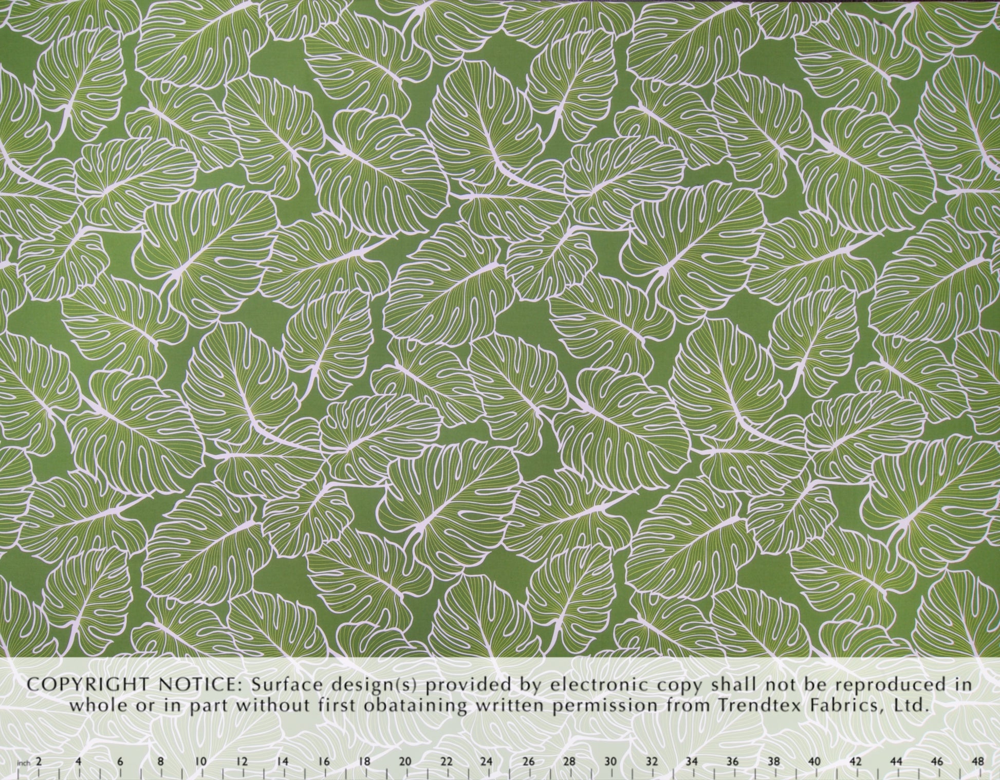 100% Cotton Poplin, 44/45"Wide, All-Over. Stylized Linework Tropical Monstera Leaves.