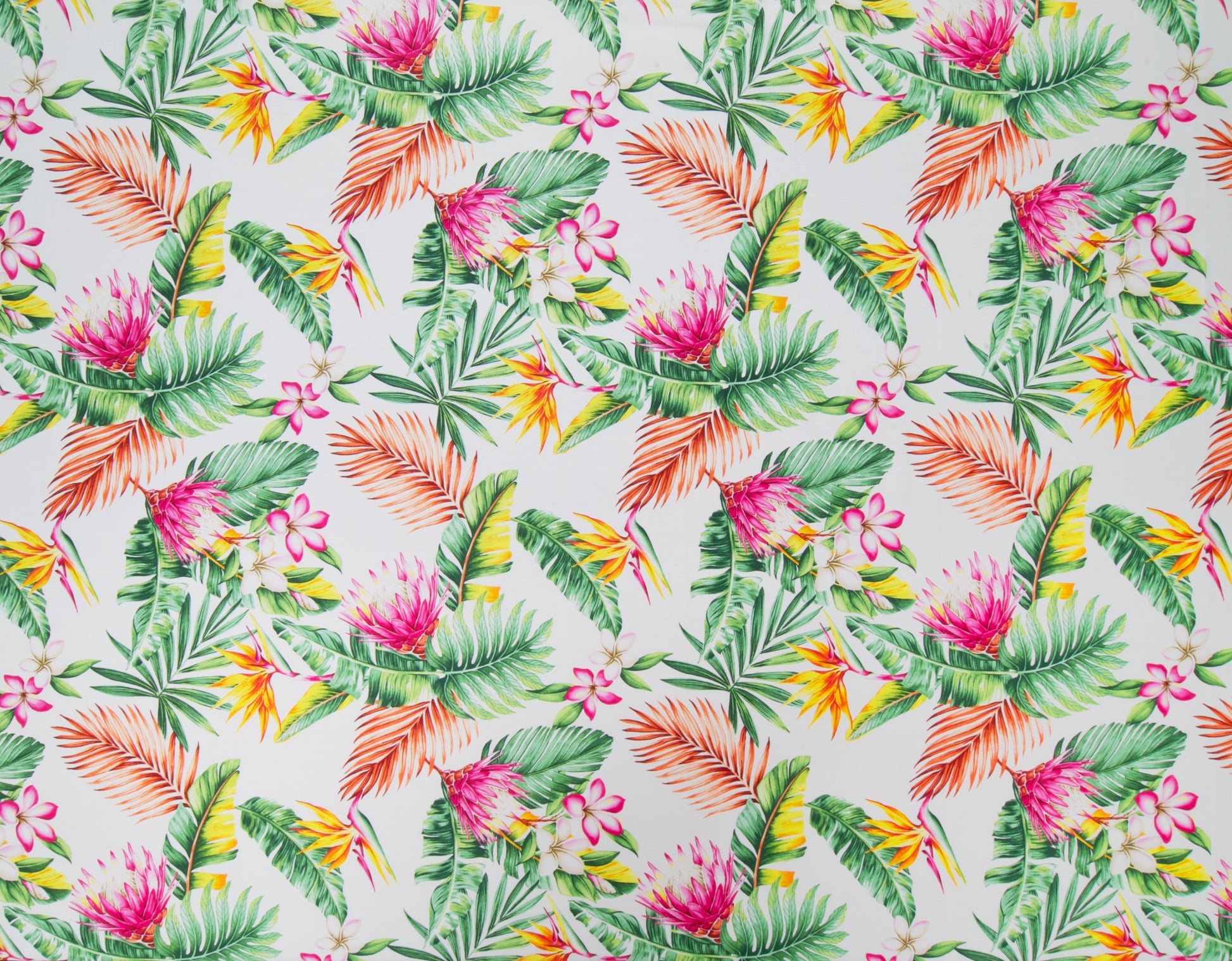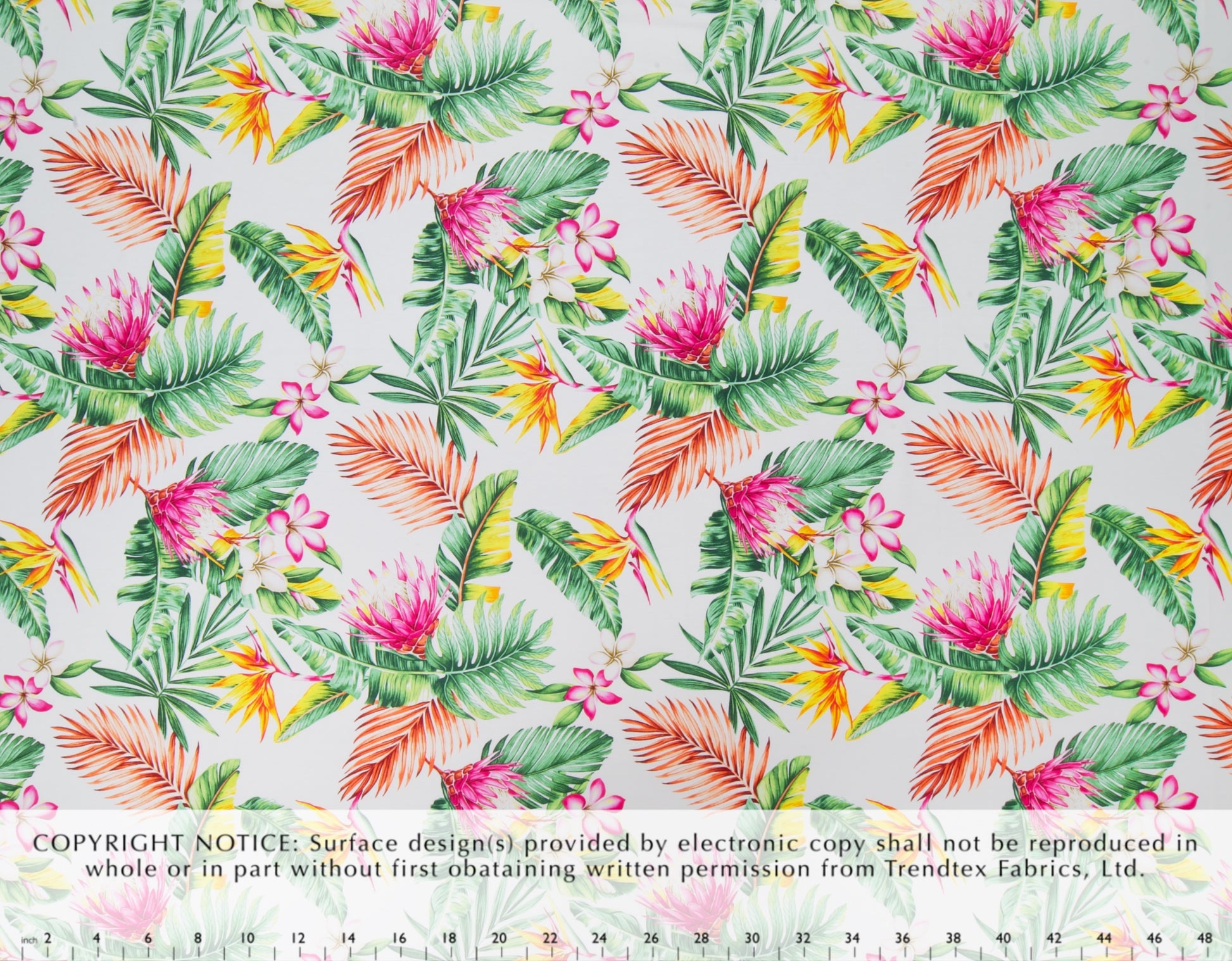 100% Cotton Poplin, 44/45"Wide, All-Over. Realistic Watercolor Technique Tropical Protea, Bird of Paradise, and Plumeria Flowers, Clustered with Tropical Leaves.