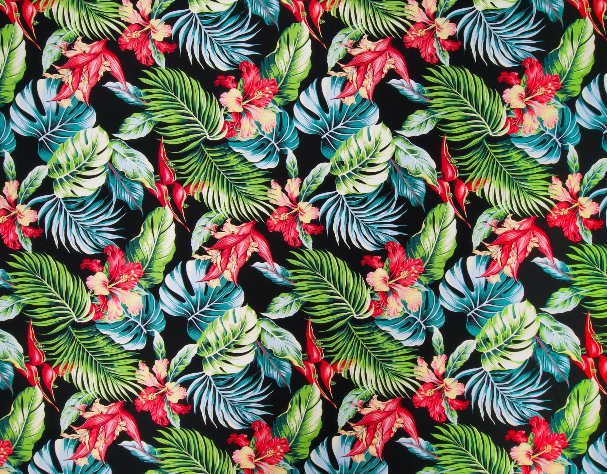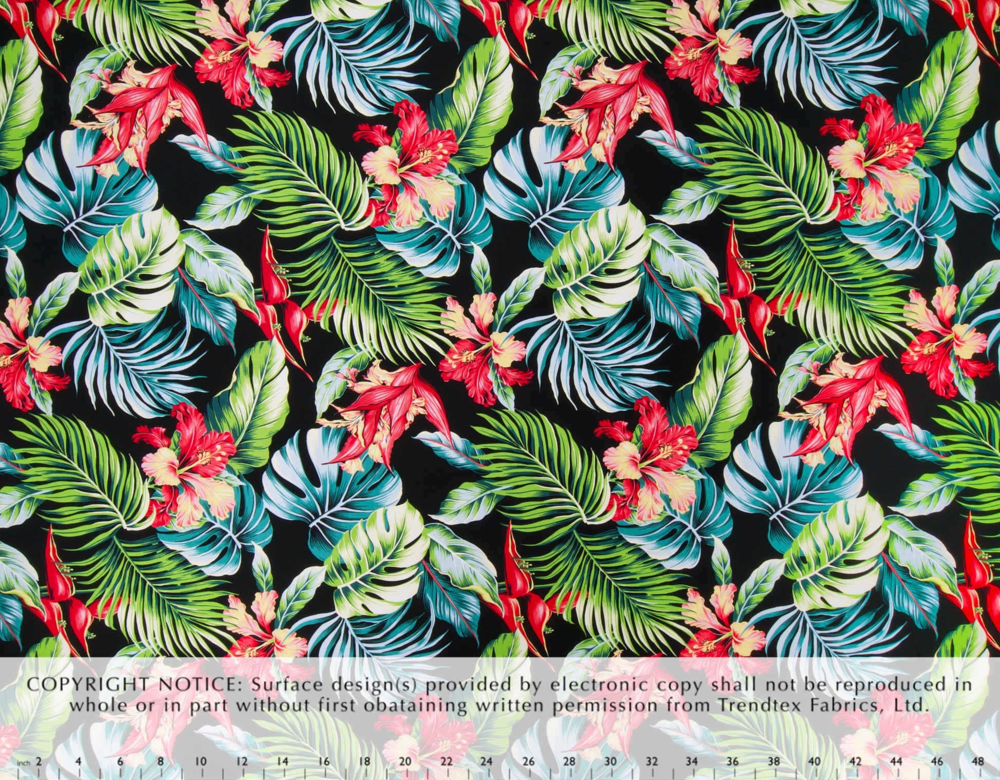 100% Cotton Poplin, 44/45"Wide, All-Over. Tropical Hibiscus and Heliconia Flowers Clustered together with Tropical Leaves.