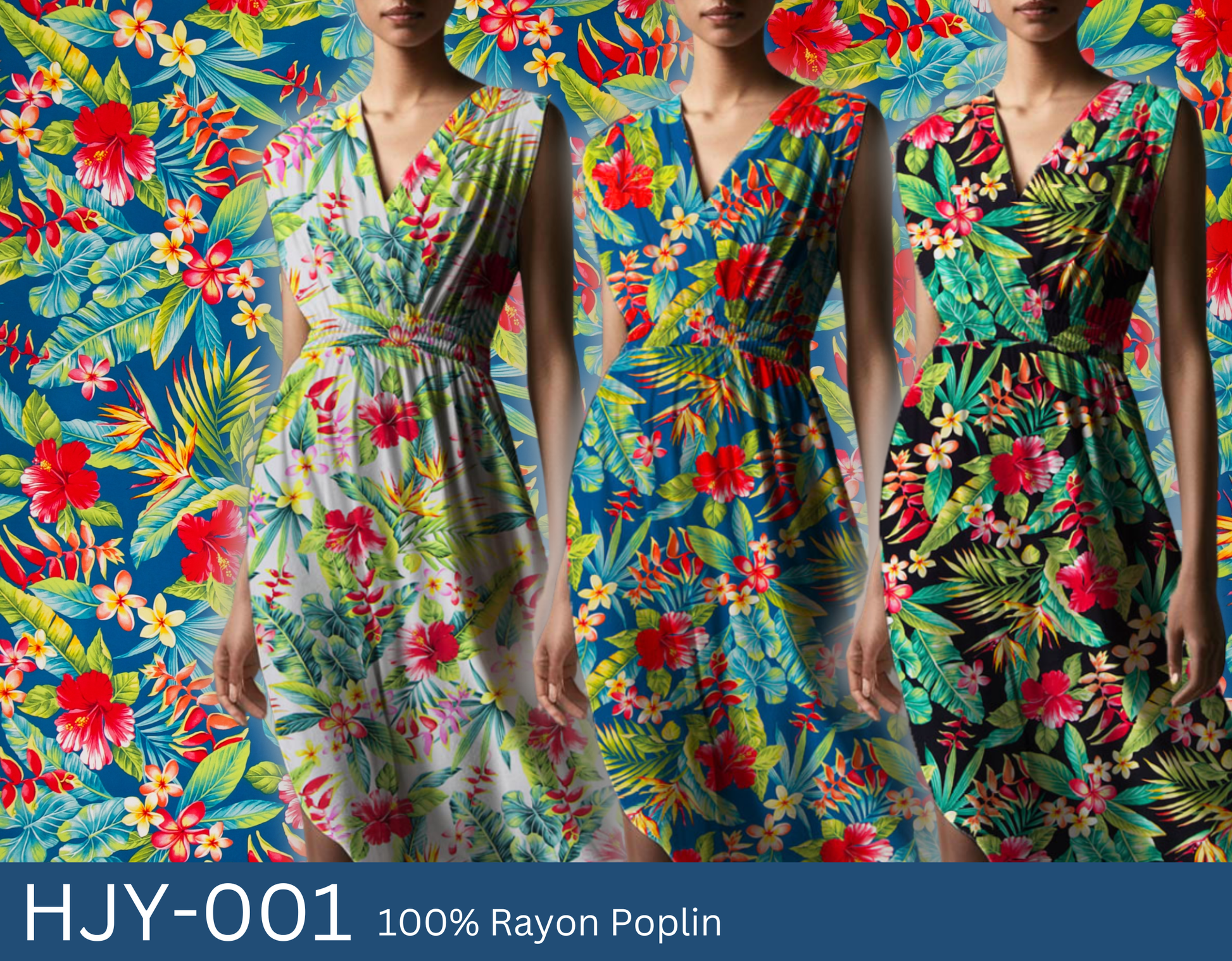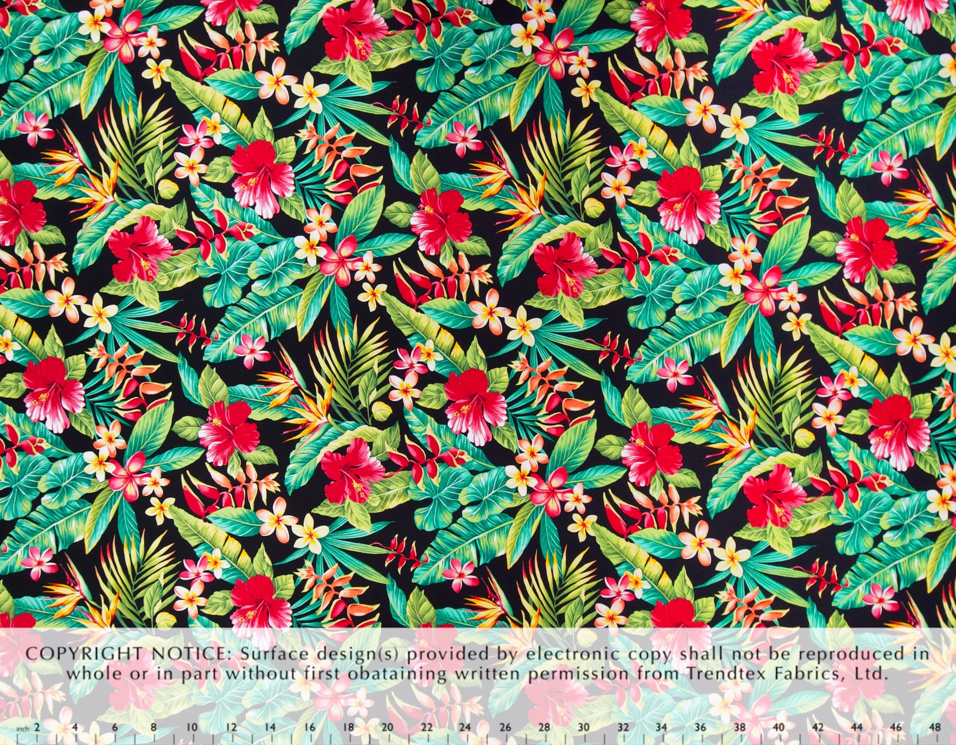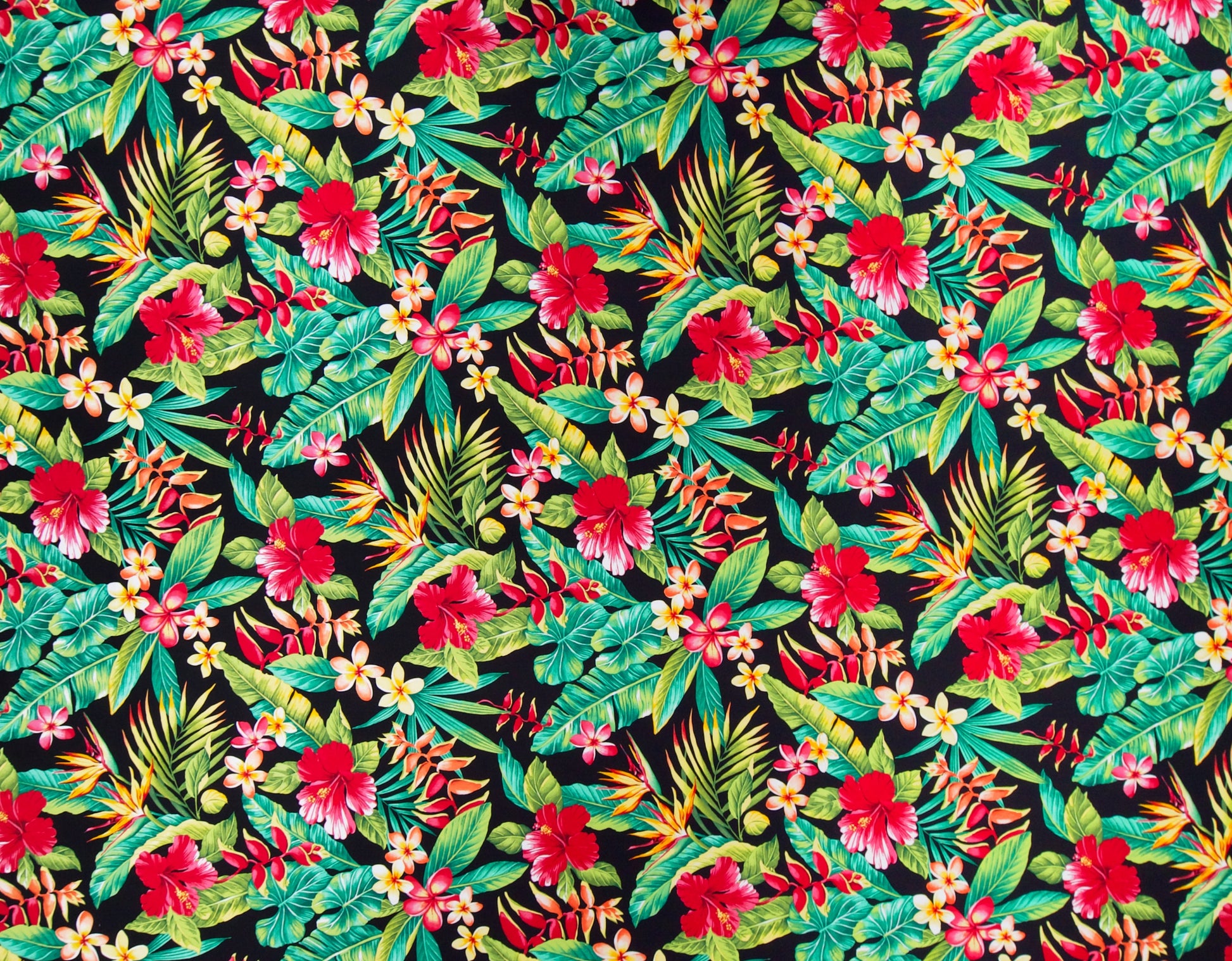 100% Rayon Poplin, 57" Wide, All-Over. A Variety of Tropical Flowers - HIbsicus, Heliconia, Bird of Paradise, and Plumeria - with All-Over Tropical Leaves.