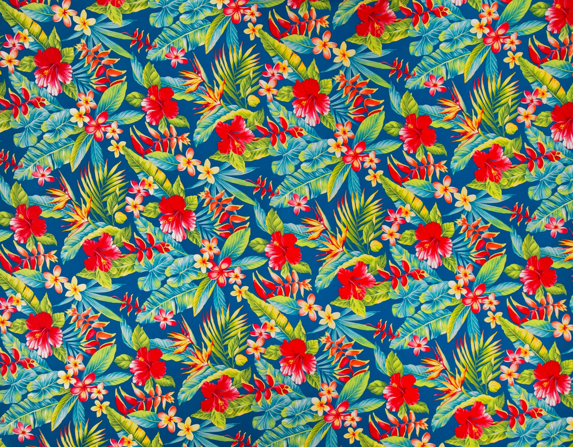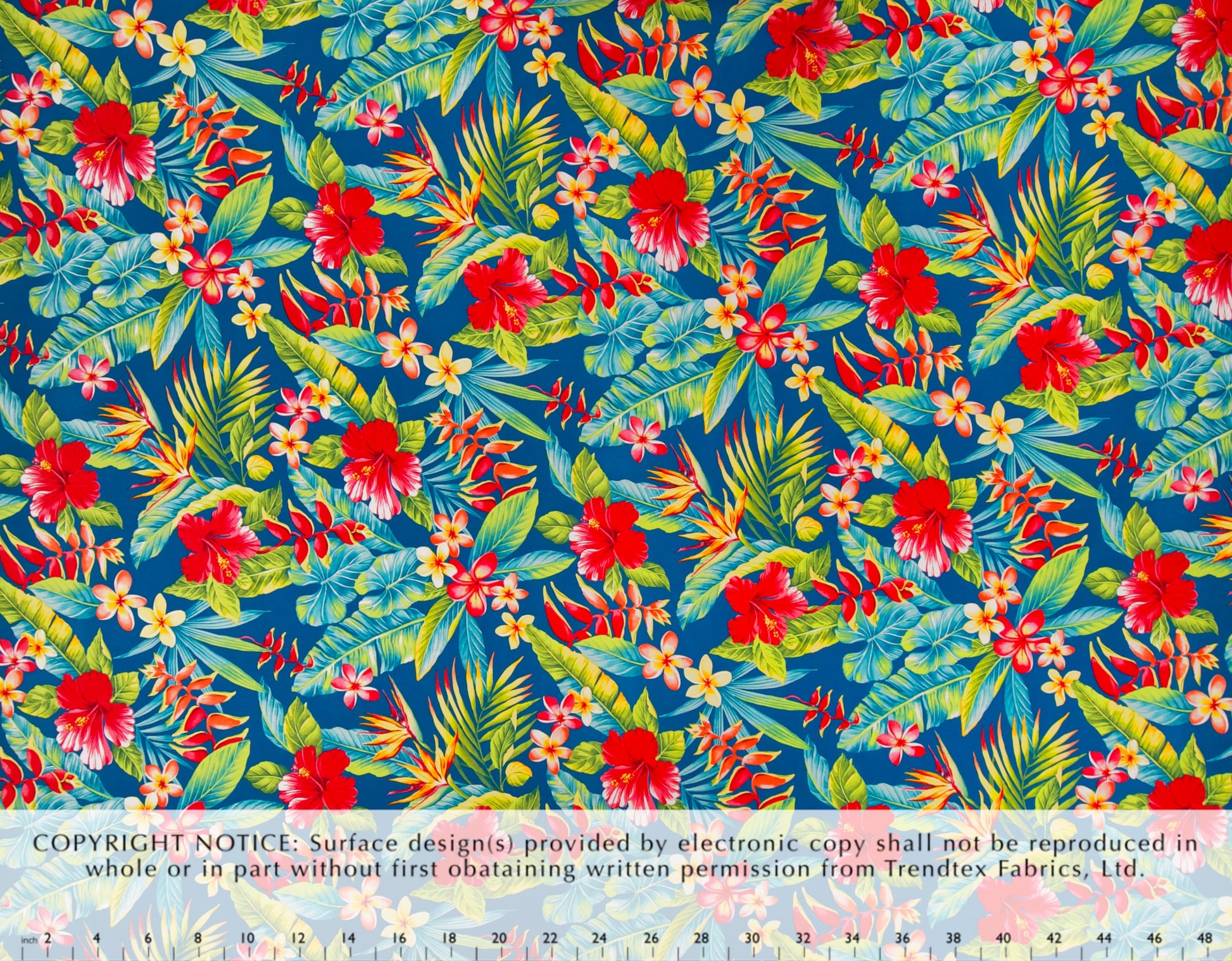 100% Rayon Poplin, 57" Wide, All-Over. A Variety of Tropical Flowers - HIbsicus, Heliconia, Bird of Paradise, and Plumeria - with All-Over Tropical Leaves.