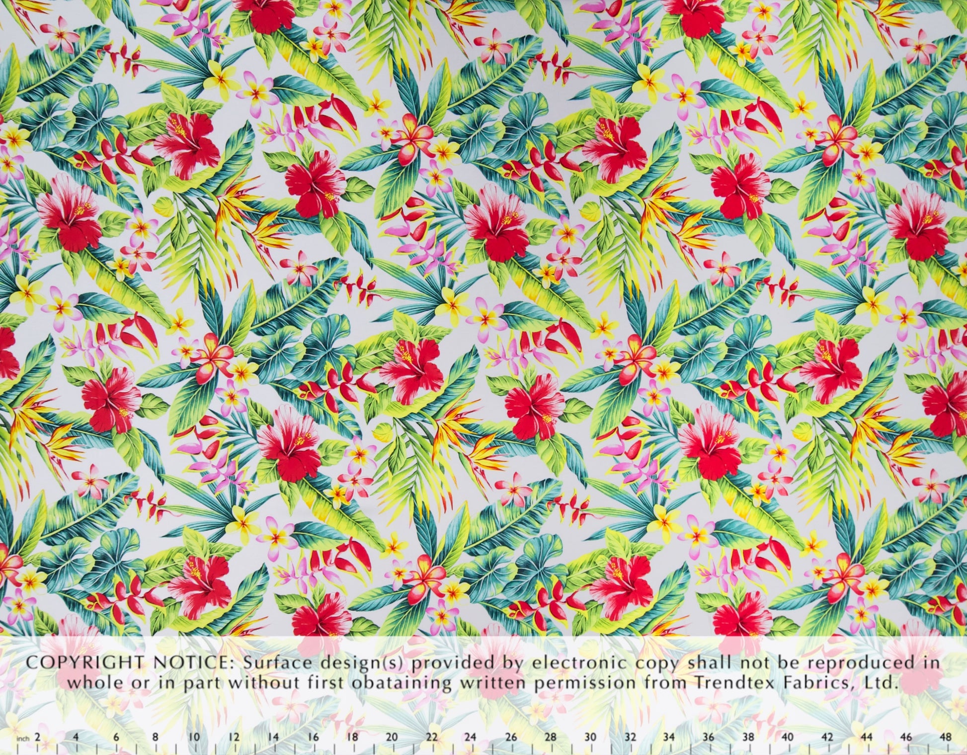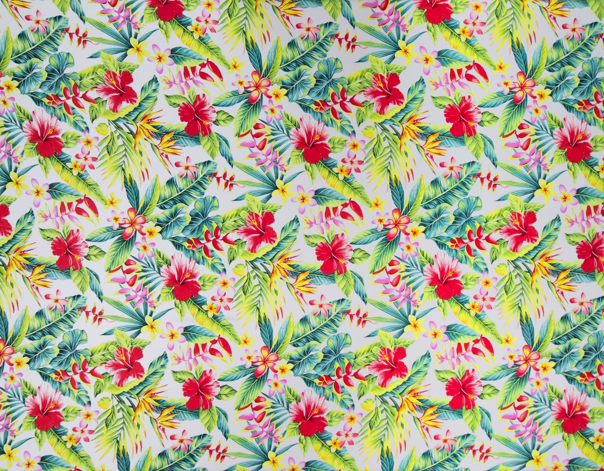 100% Rayon Poplin, 57" Wide, All-Over. A Variety of Tropical Flowers - HIbsicus, Heliconia, Bird of Paradise, and Plumeria - with All-Over Tropical Leaves.