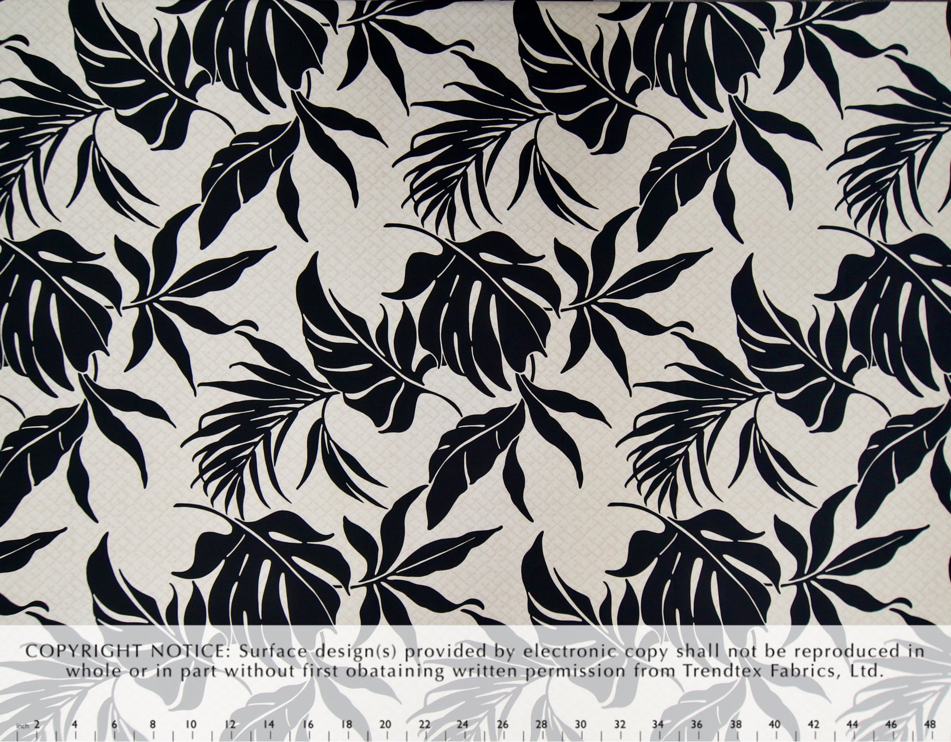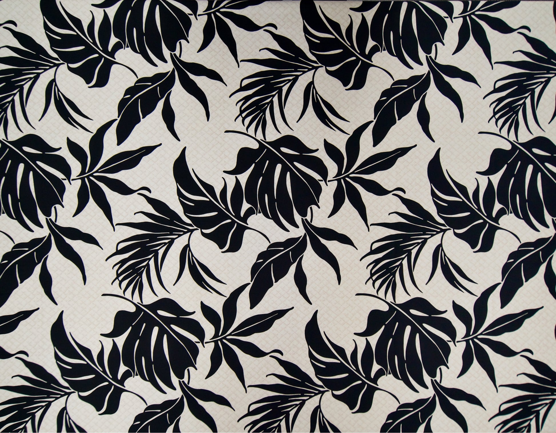 100% Cotton Poplin, 44/45"Wide, All-Over. Stylized Tropical Leaf Silhouettes on a Background of Woven Lauhala.