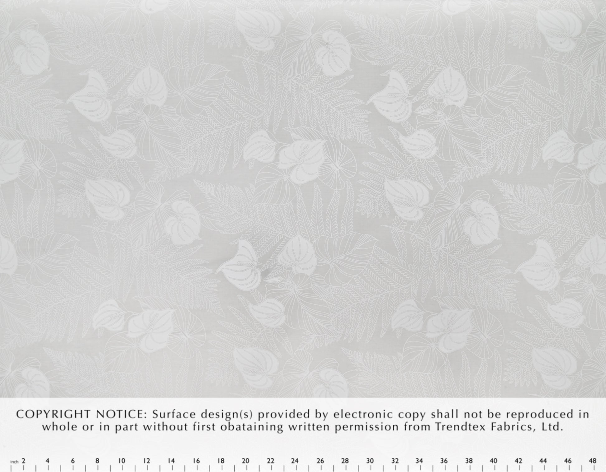 65% Polyester/35% Cotton Poplin, 44/45" Wide, All-Over. Stylized Anthurium Flowers, Kalo and Fern Leaves.