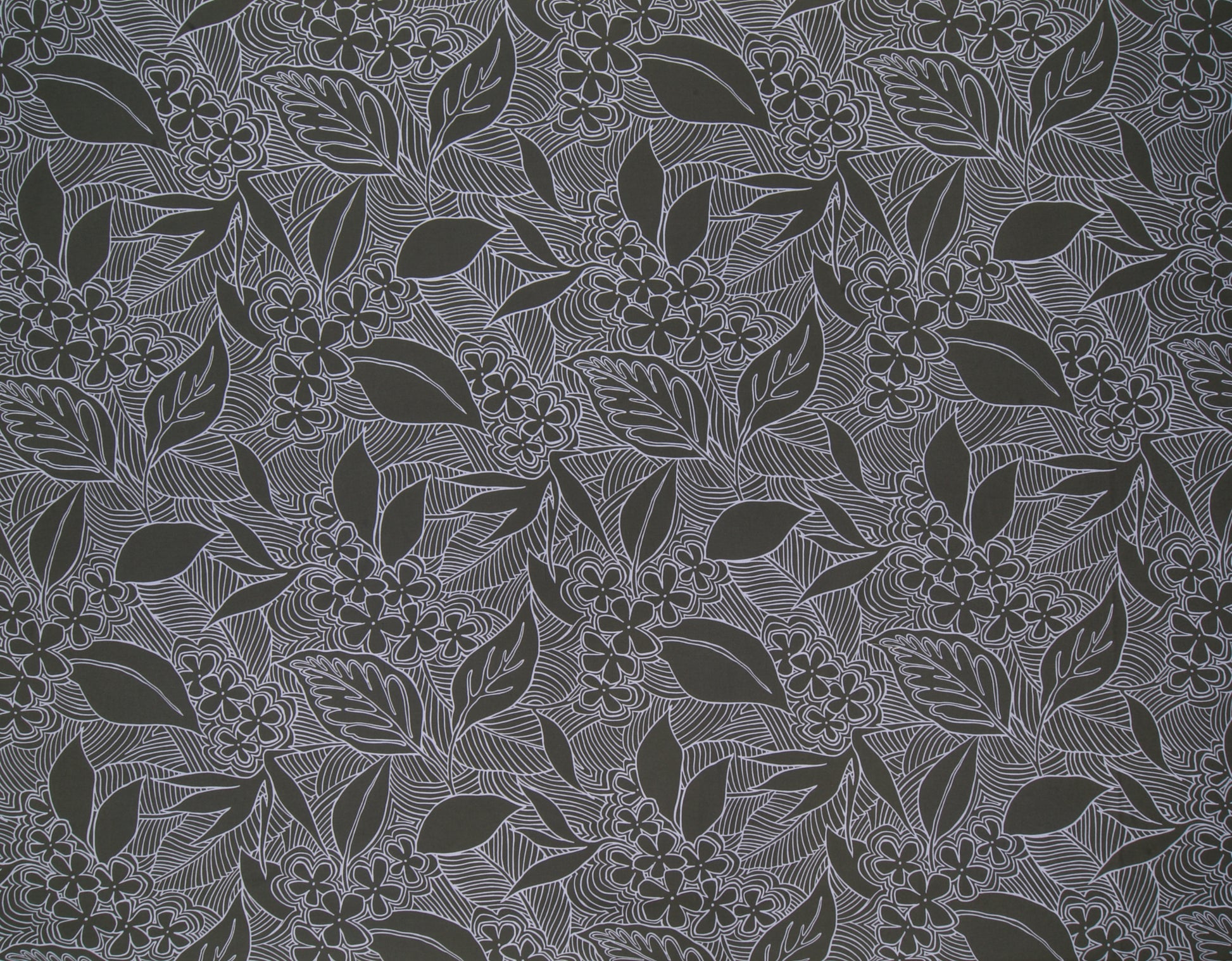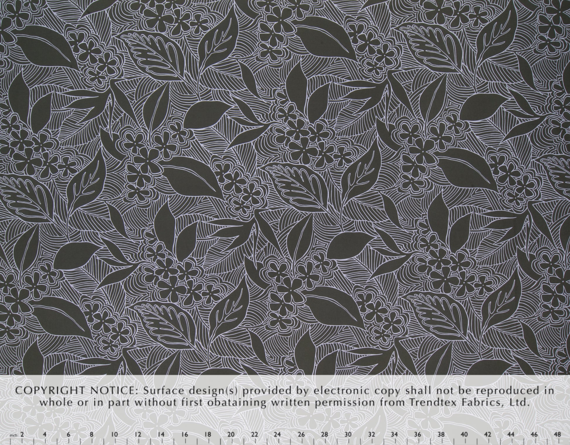 100% Cotton Poplin, 44/45"Wide, One-Way. Stylized Boho Outline of Clustered Plumeria and Bird of Paradise Flowers.