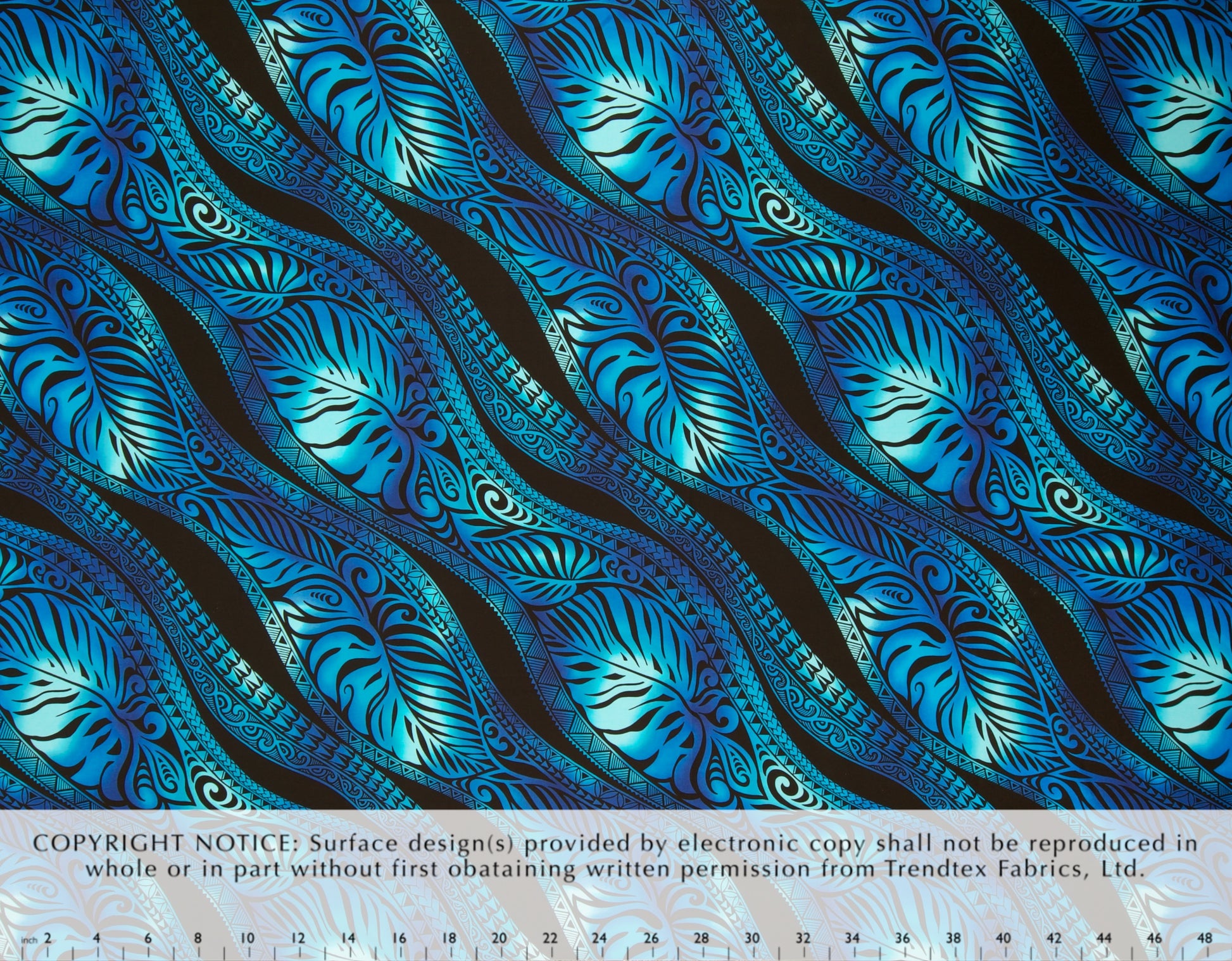 100% Cotton Poplin, 44/45"Wide, All-Over. Diagonal Ombre Tribal Tattoo with Stylized Tropical Leaf.