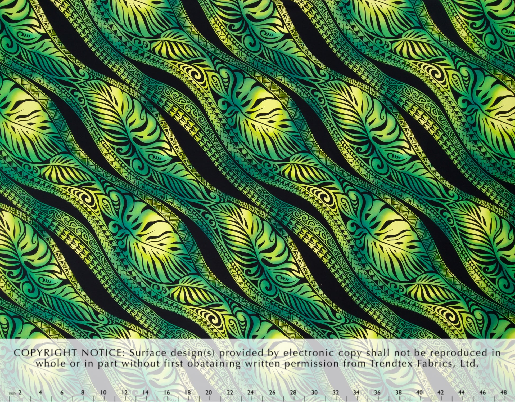 100% Cotton Poplin, 44/45"Wide, All-Over. Diagonal Ombre Tribal Tattoo with Stylized Tropical Leaf.