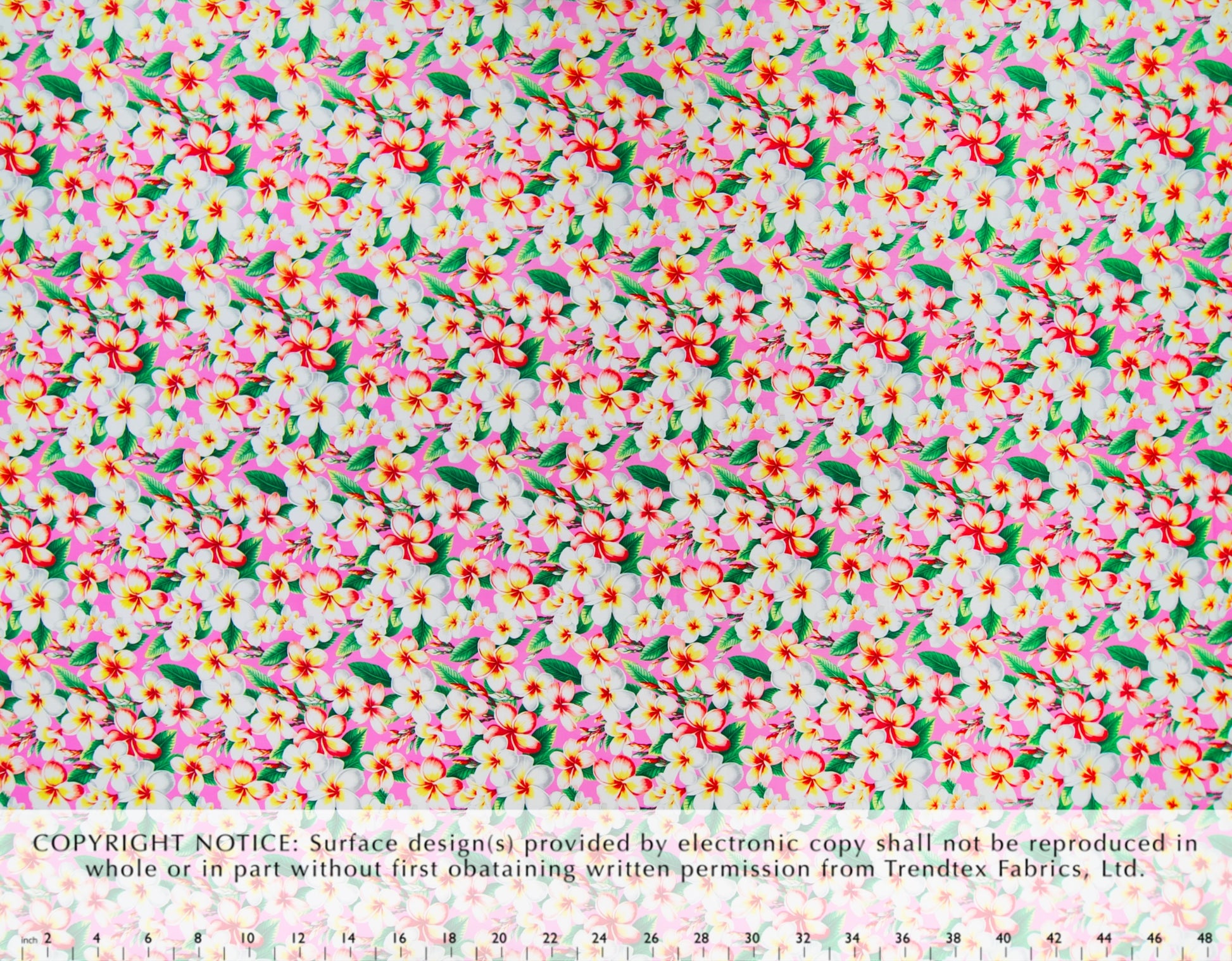 100% Cotton Poplin, 44/45"Wide, All-Over. Realistic Tropical Plumeria Flowers and Leaves on a Solid Background.