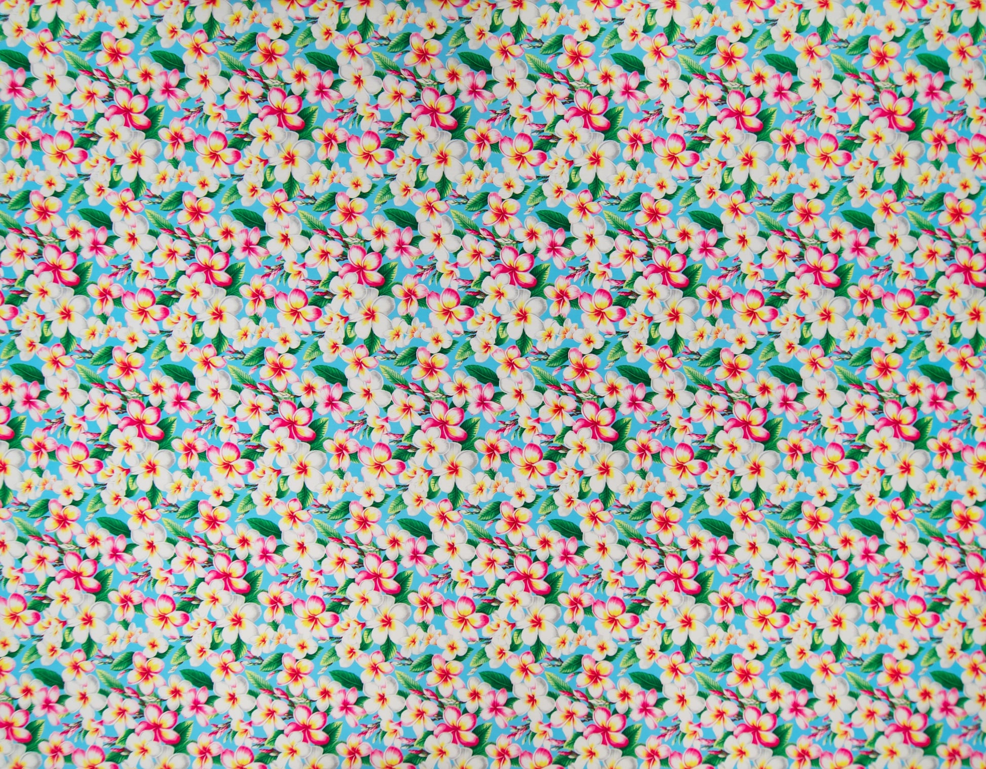 100% Cotton Poplin, 44/45"Wide, All-Over. Realistic Tropical Plumeria Flowers and Leaves on a Solid Background.