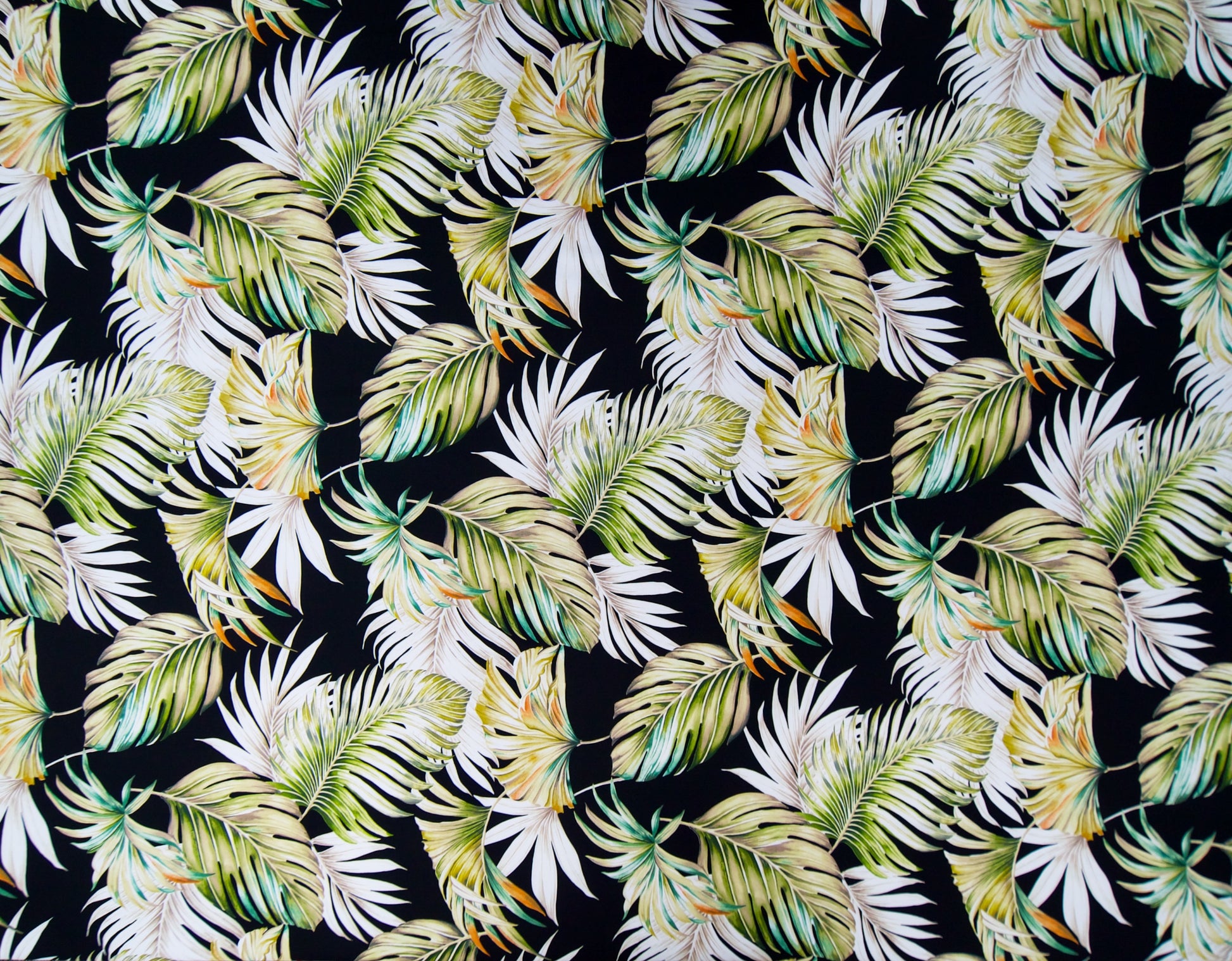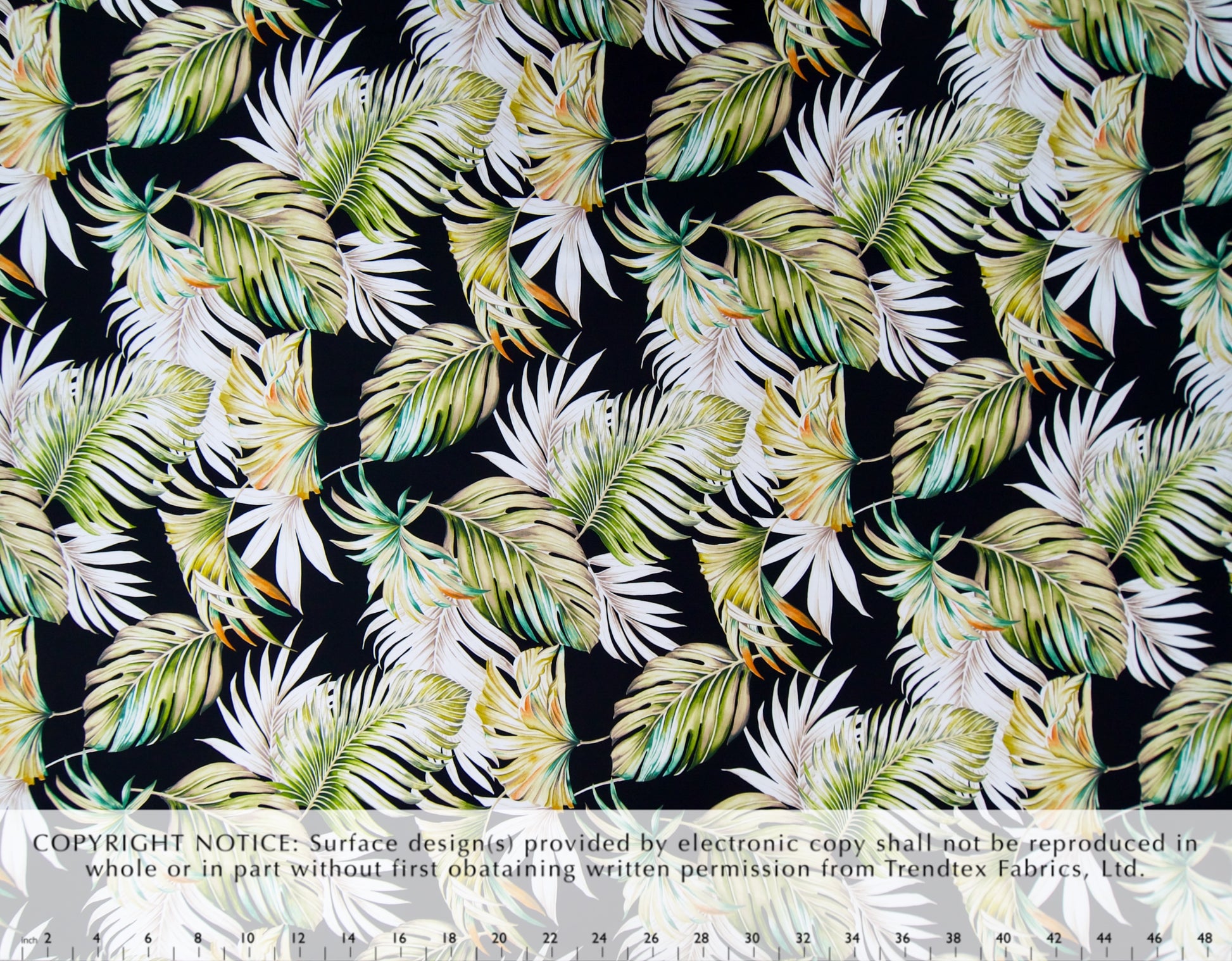 100% Rayon Poplin, 57" Wide, All-Over. Realistic Watercolor Tropical Leaves on a Solid Background.