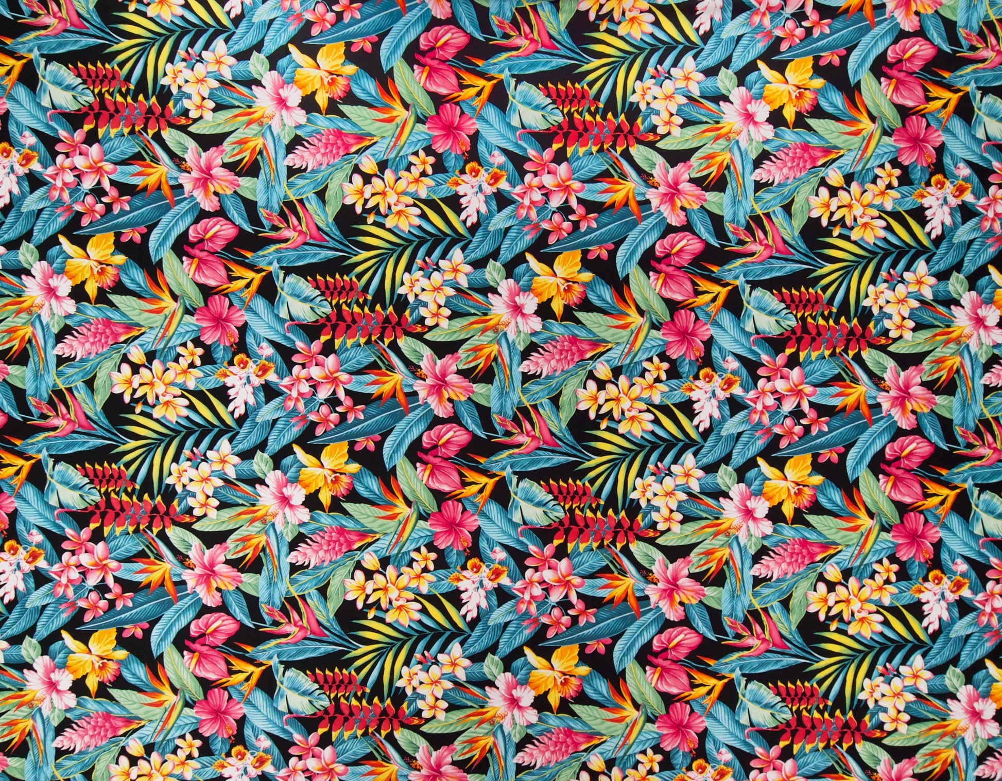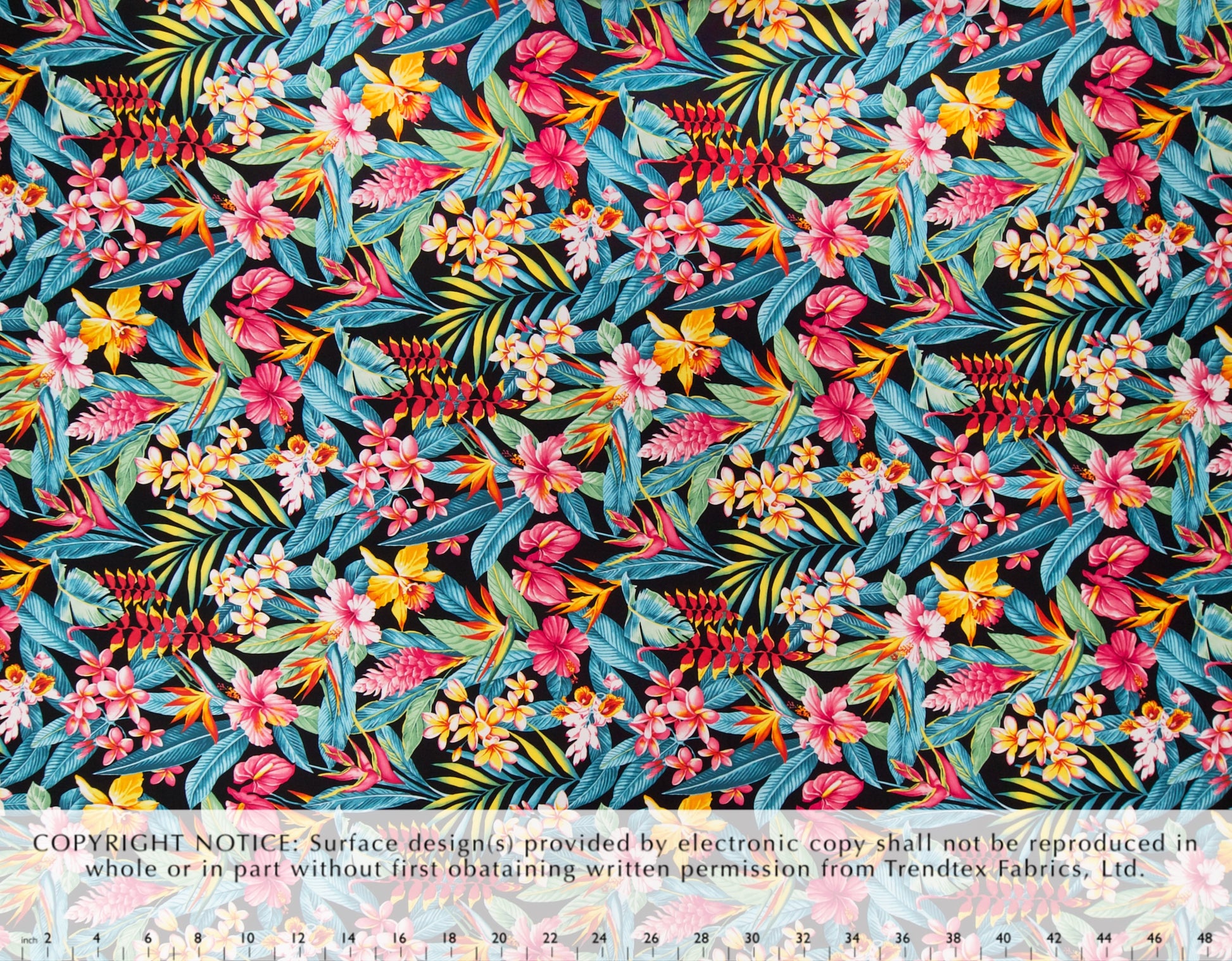 100% Cotton Poplin, 44/45"Wide, One-Way. All Over Watercolor Style Tropical Flowers, including Hibiscus, Plumeria, Heliconia, Orchids, Torch Ginger, and Bird of Paradise.