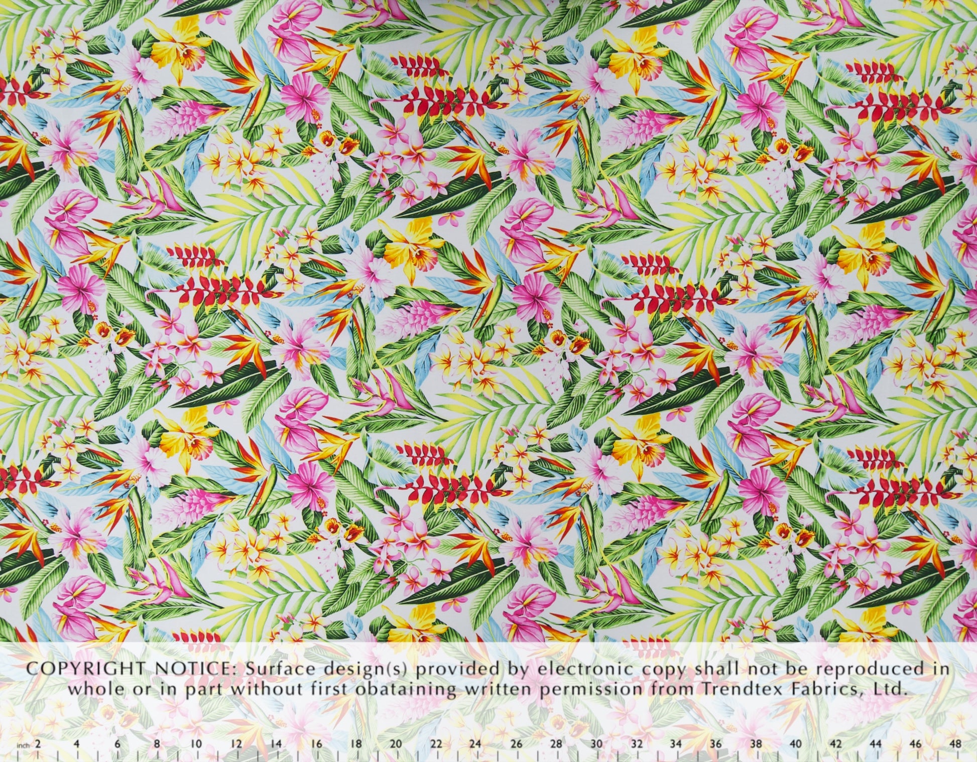 100% Cotton Poplin, 44/45"Wide, One-Way. All Over Watercolor Style Tropical Flowers, including Hibiscus, Plumeria, Heliconia, Orchids, Torch Ginger, and Bird of Paradise.