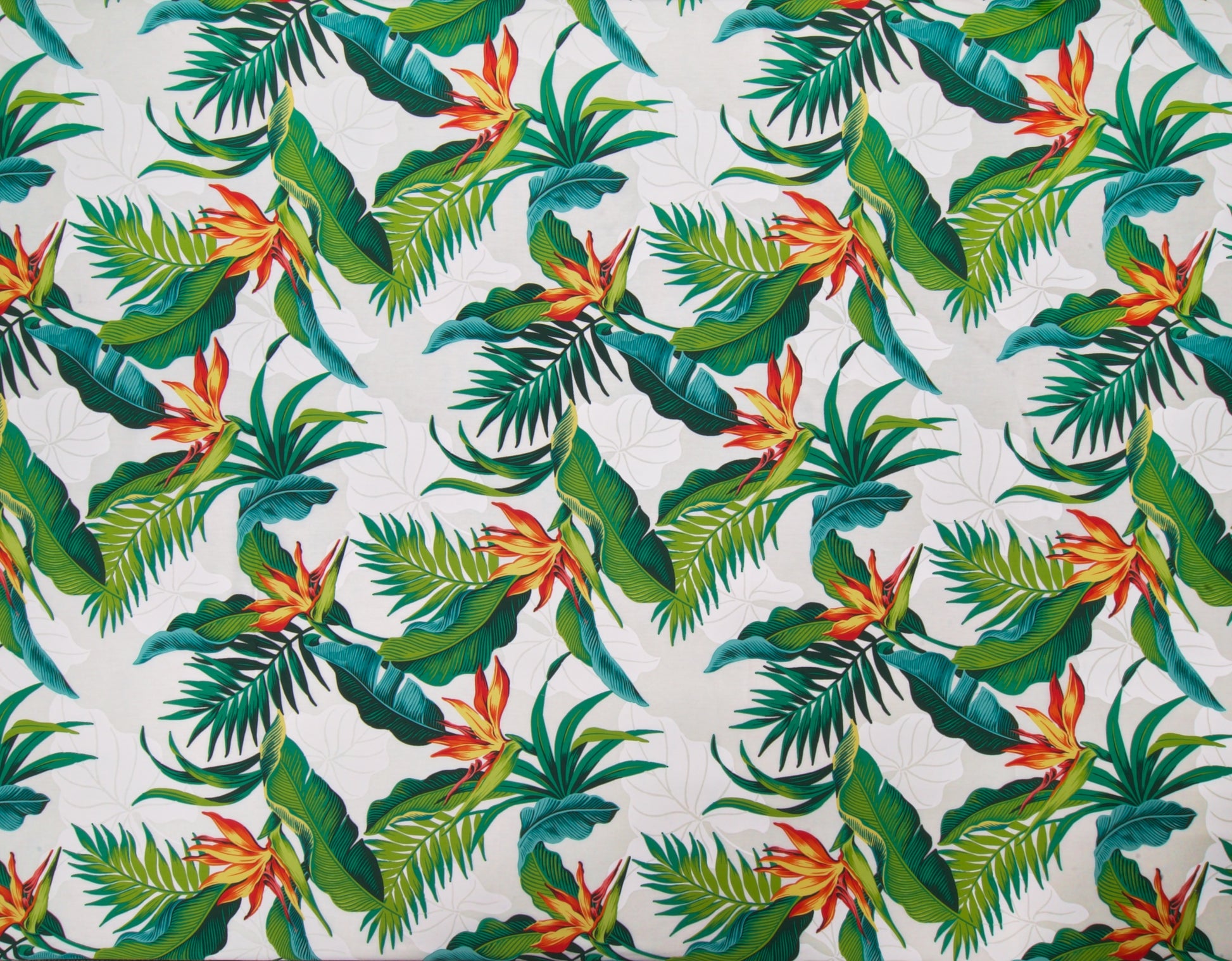 100% Cotton Poplin, 44/45"Wide, One-Way. Bird of Paradise with a Background of Tropical Leaves.